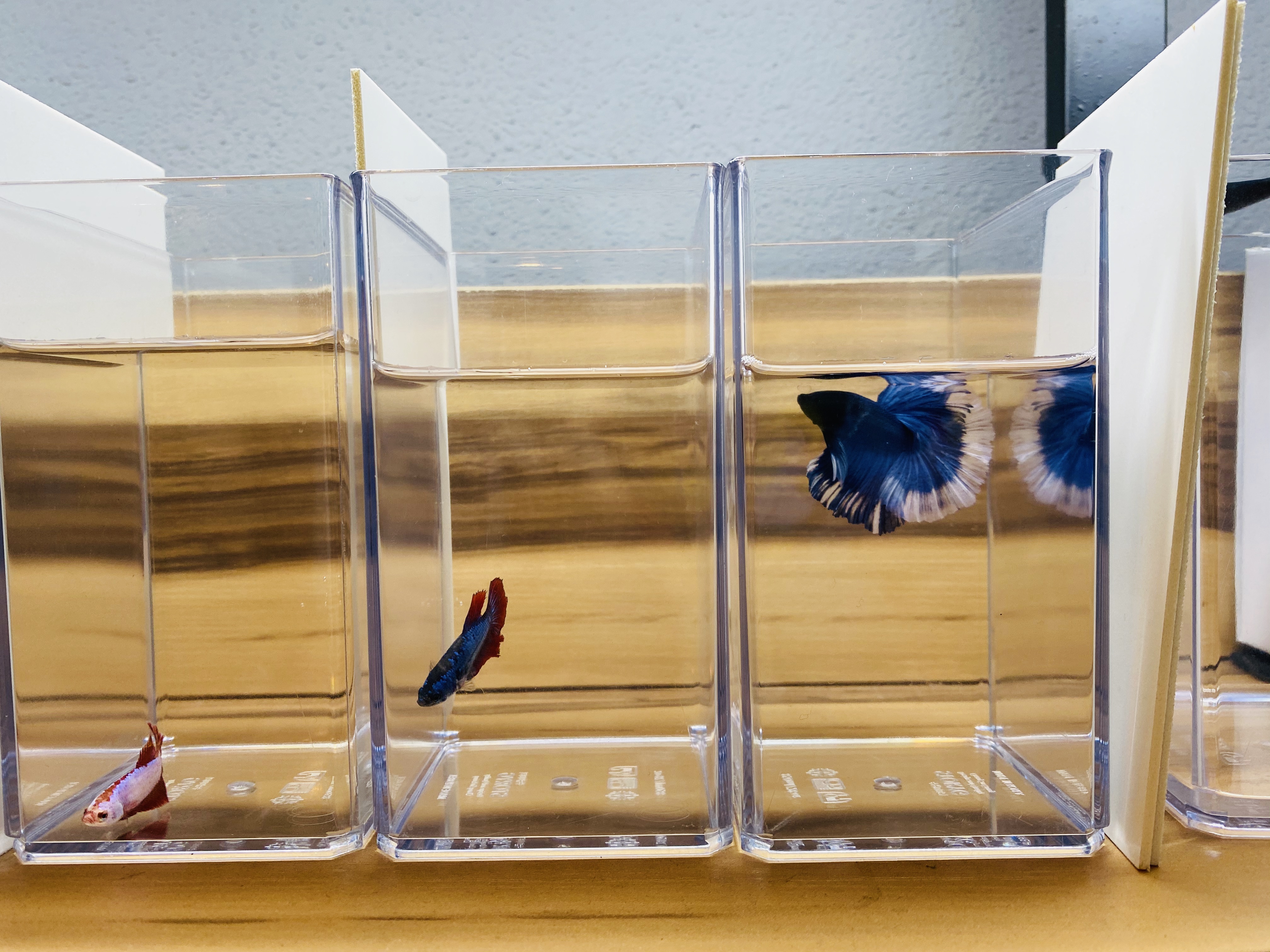 다양한 색감의 베타가 있었습니다. 베타는 여러 마리가 한 어항에 있으면 한 마리가 남을 때까지 싸우기때문에 꼭 1마리씩 키워야 한다고 해요. 그래서 어항에 1마리만 넣어두고 어항들 간에도 서로를 보지 못하도록 칸막이를 쳐두었습니다.
