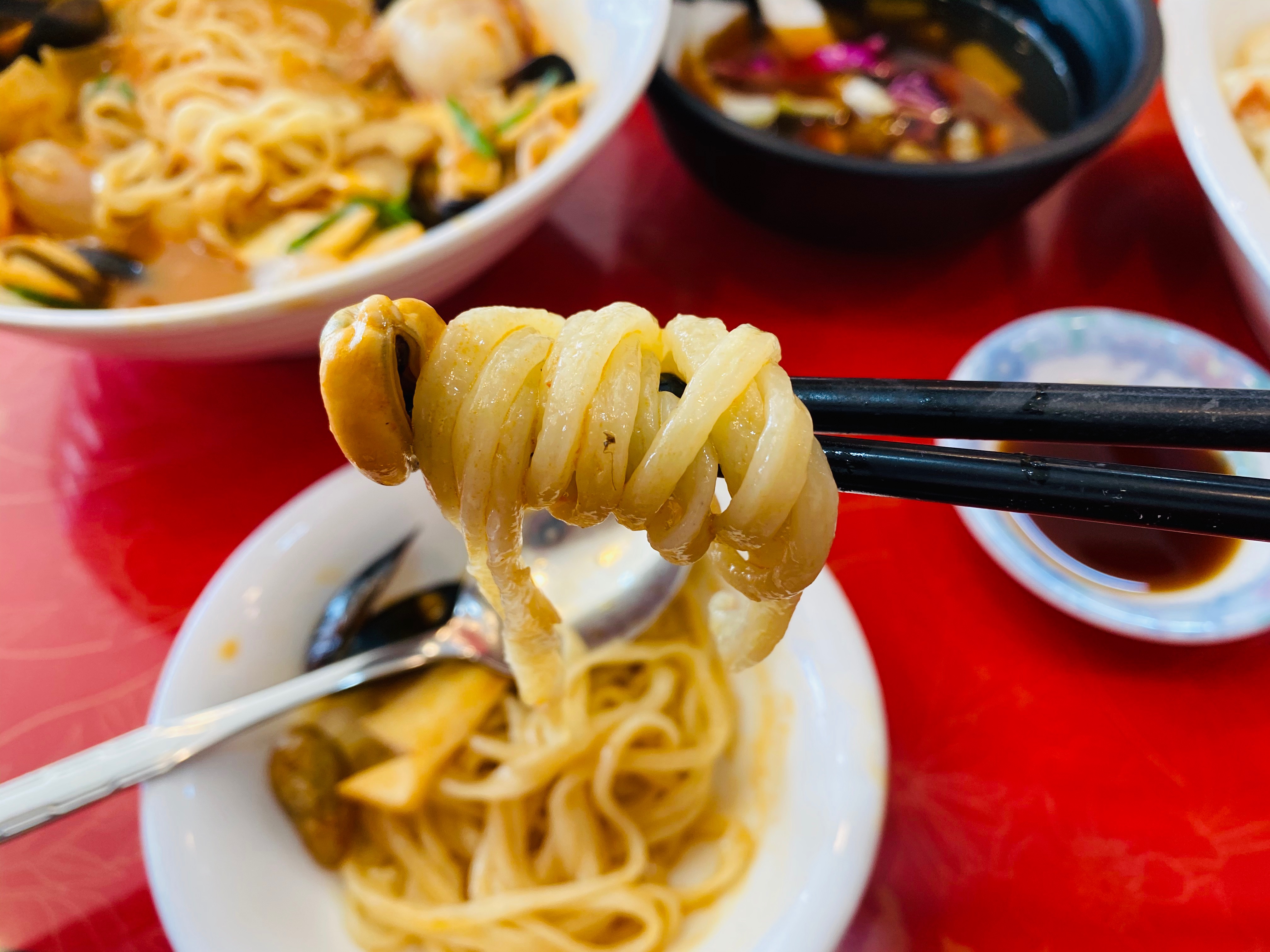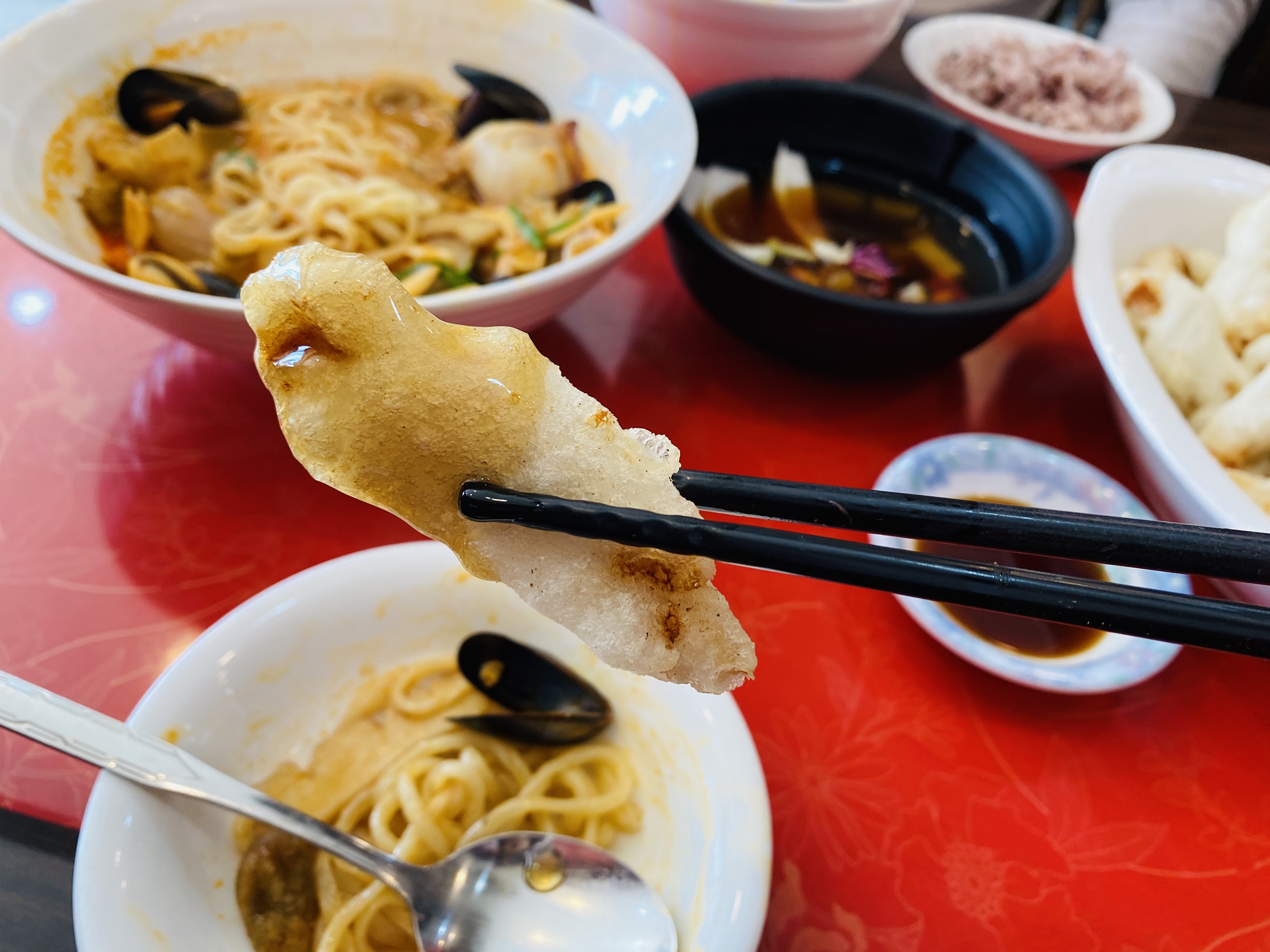 무엇보다 수타면이라 그런지 면이 엄청 탱글탱글하고 쫄깃했어요. 기계로 뽑은 면에 익숙해져 면 굵기가 동일한걸 당연하게 생각하며 살았는데, 수타면답게 면의 굵기가 조금씩 다른 것도 재밌었어요.