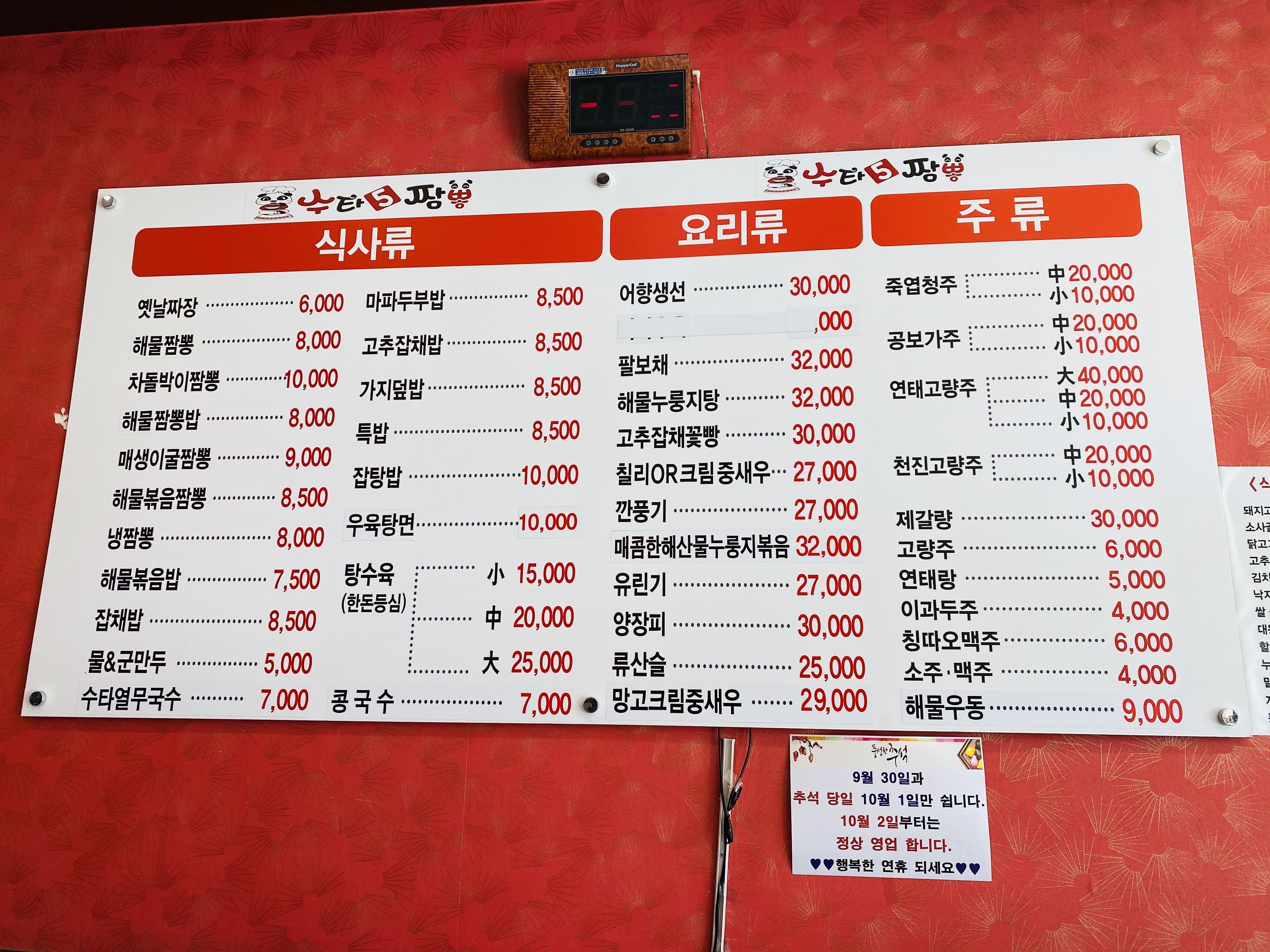짜장, 짬뽕, 볶음밥 등 식사메뉴부터 탕수육, 깐풍기, 유린기, 양장피까지 중국집에 있을만한 요리 메뉴도 풍부했습니다. 짬뽕이 유명하다고 해서, 저희는 '해물짬뽕'과 '탕수육'을 시켰봤습니다.