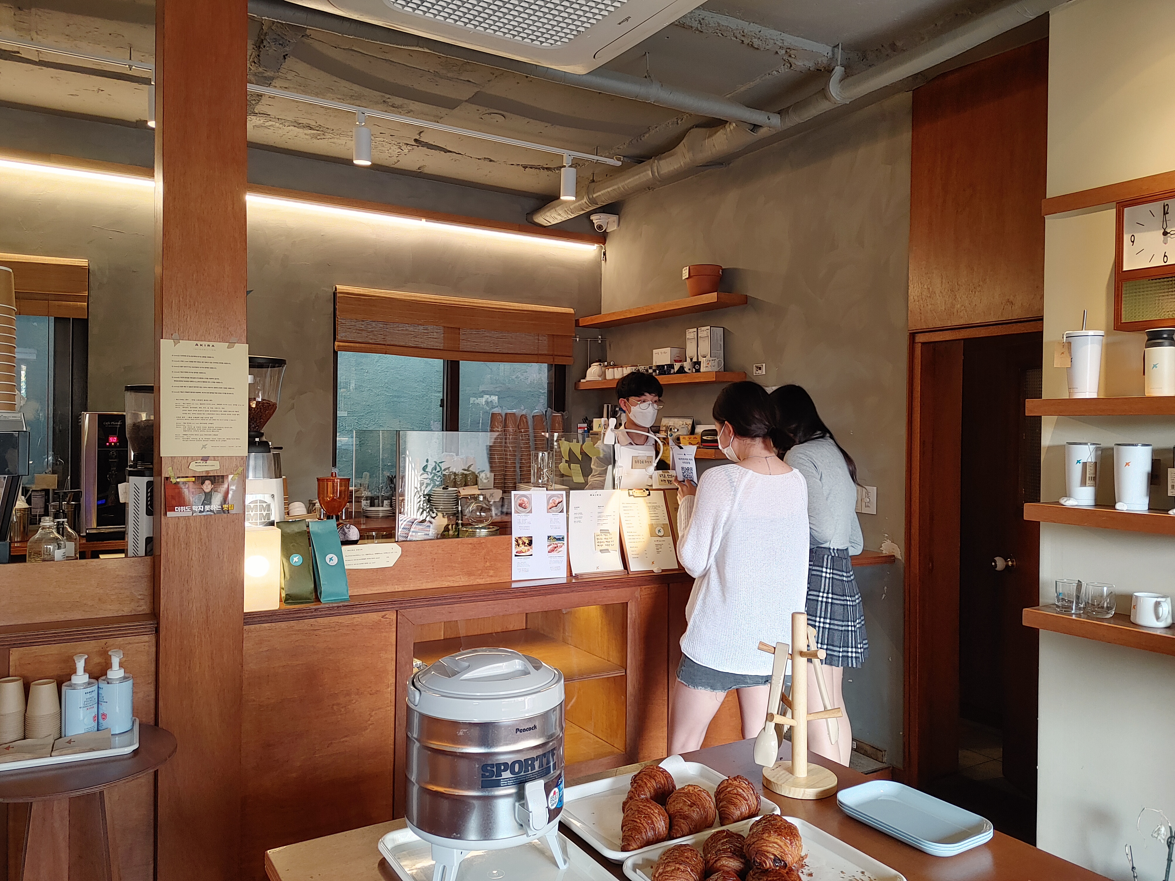문을 열고 들어가면 주문 받는 곳과 커피 내리는 곳이 있는데, 역시나 원목 느낌을 살려 깔끔하고 포근한 느낌이에요.