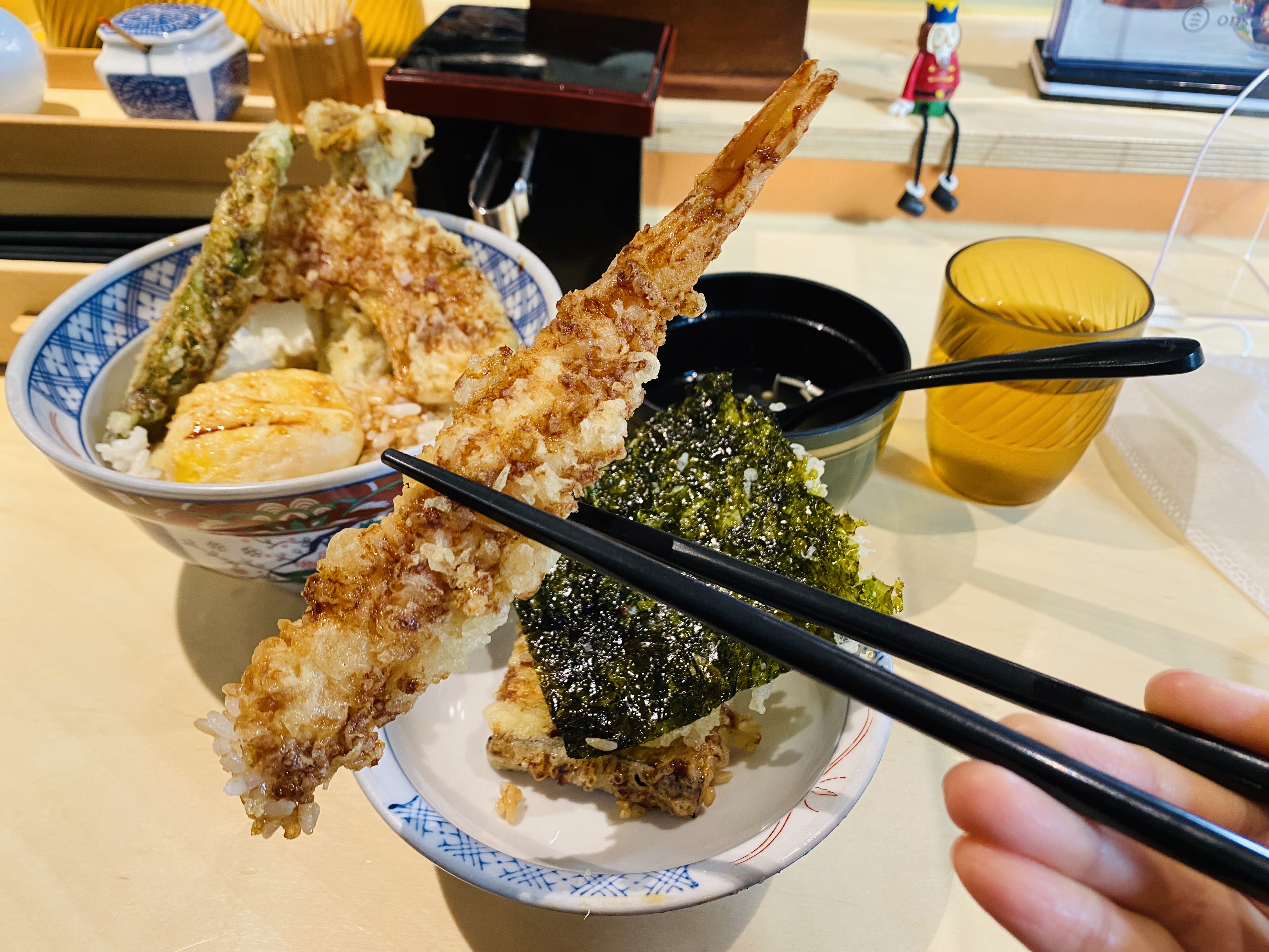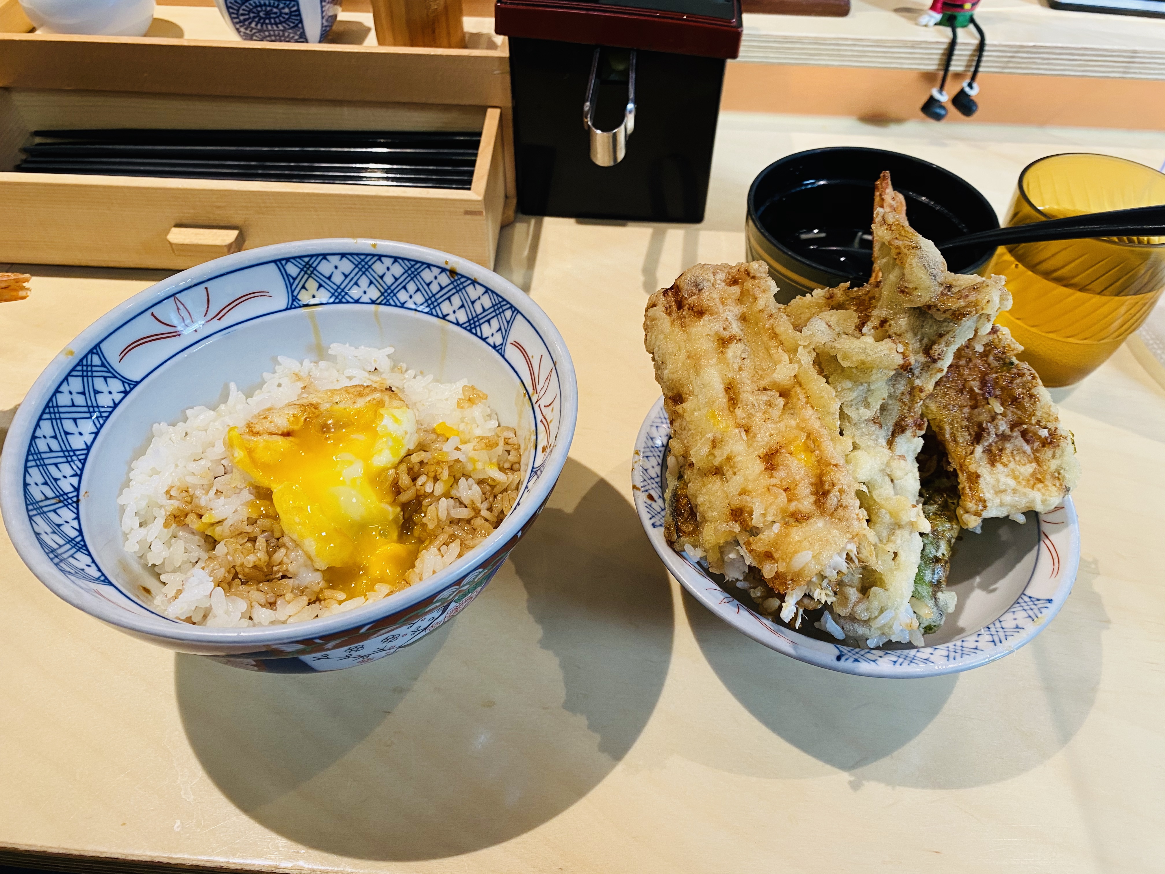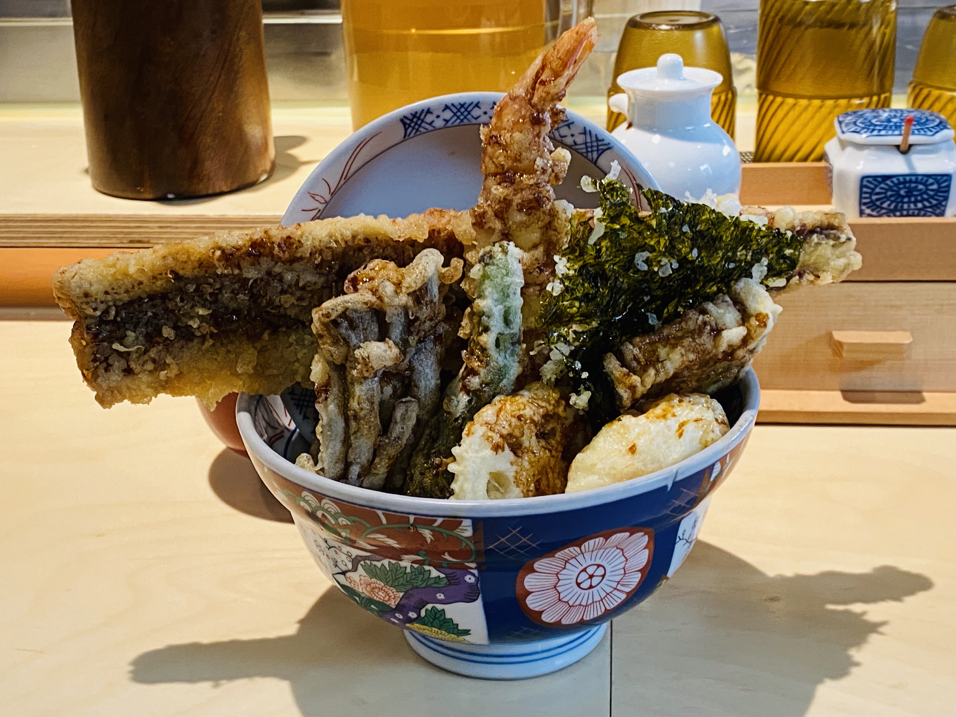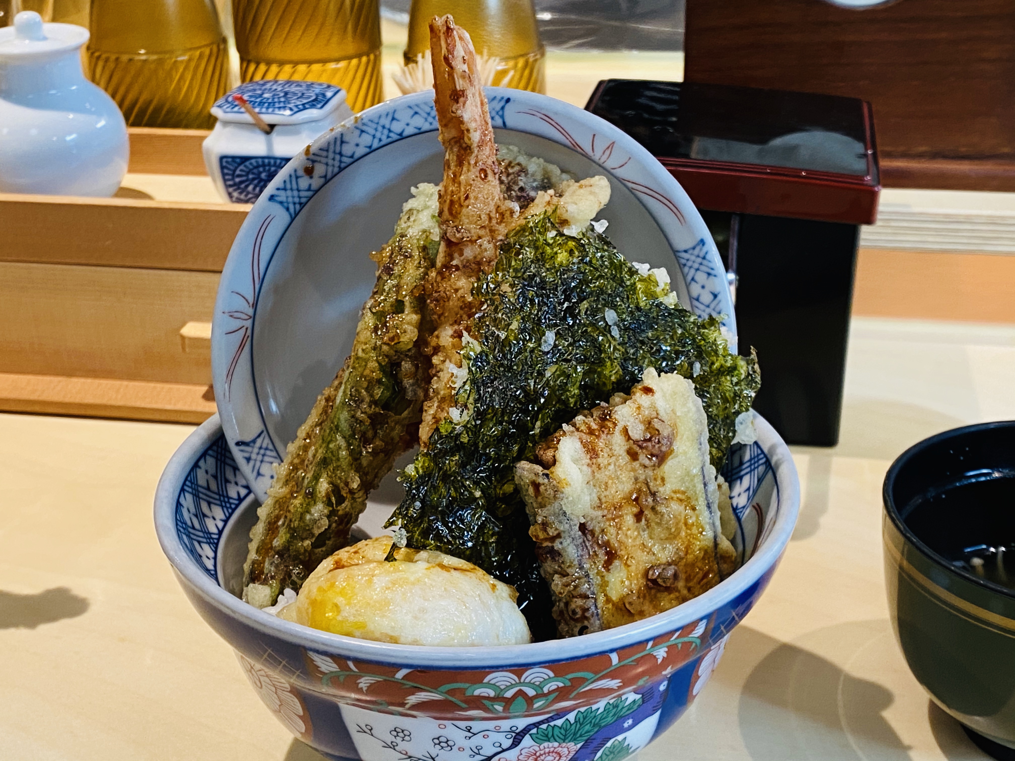 10분 정도 기다리니 메뉴가 나왔습니다. 이건 기본 메뉴인 '온센텐동'이에요. 새우, 김, 단호박, 꽈리고추, 온센 타마고(반숙 계란), 느타리버섯, 가지 이렇게 7가지 튀김이 들어가 있어요.