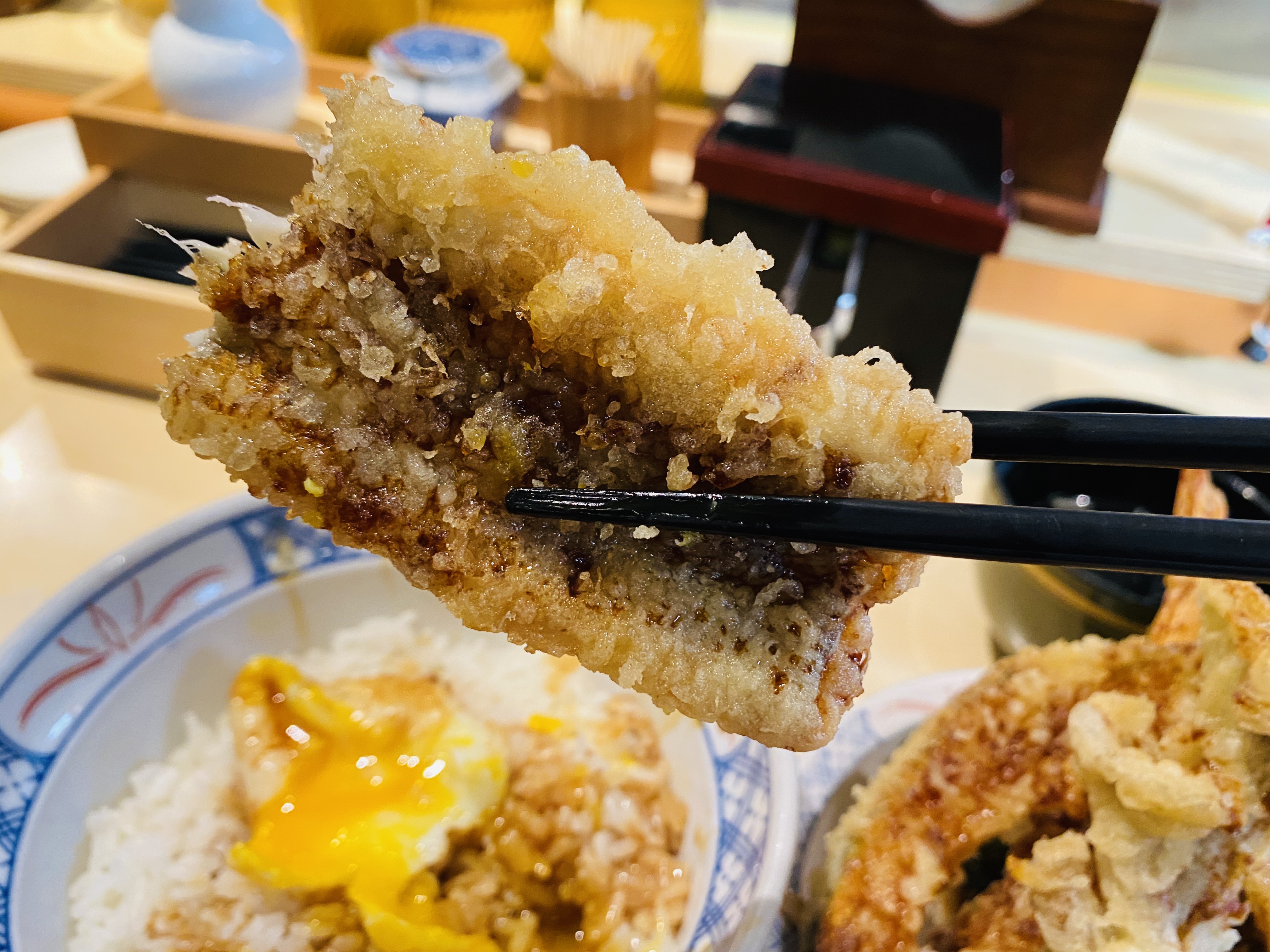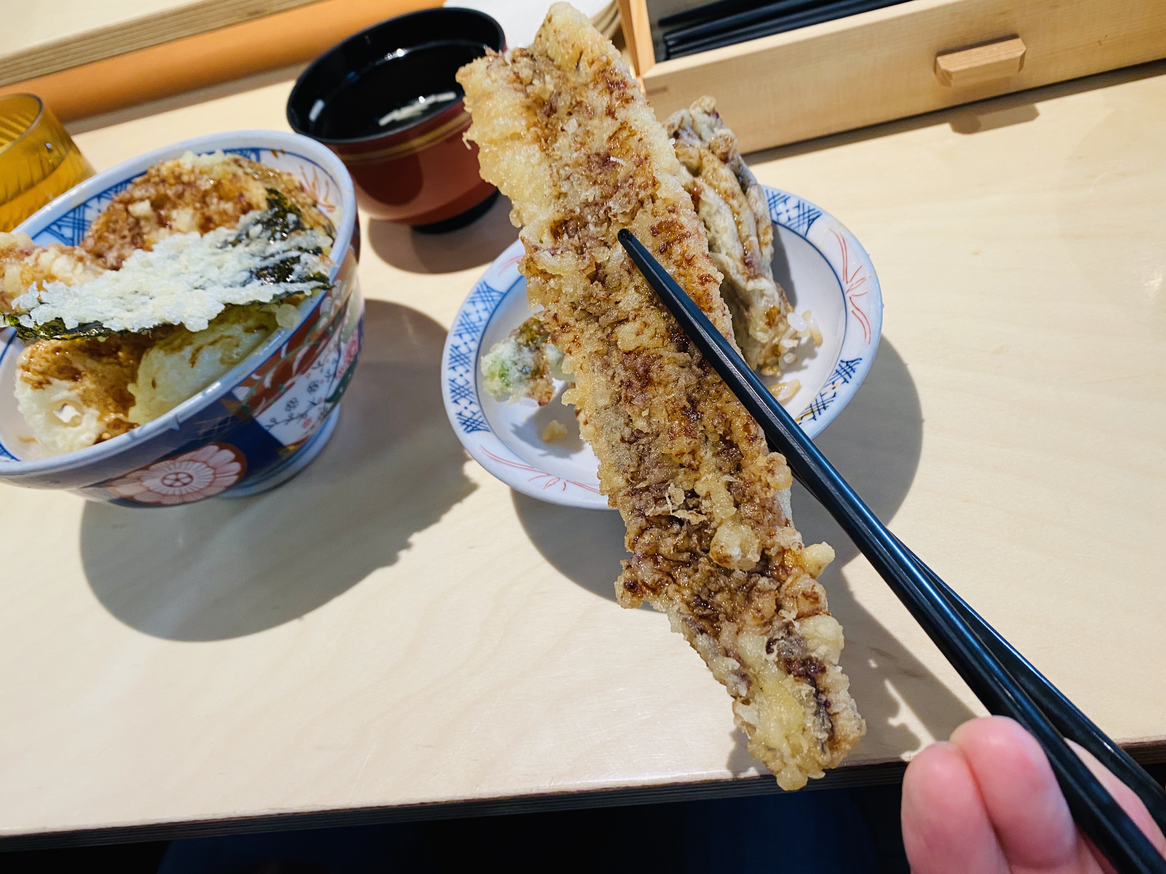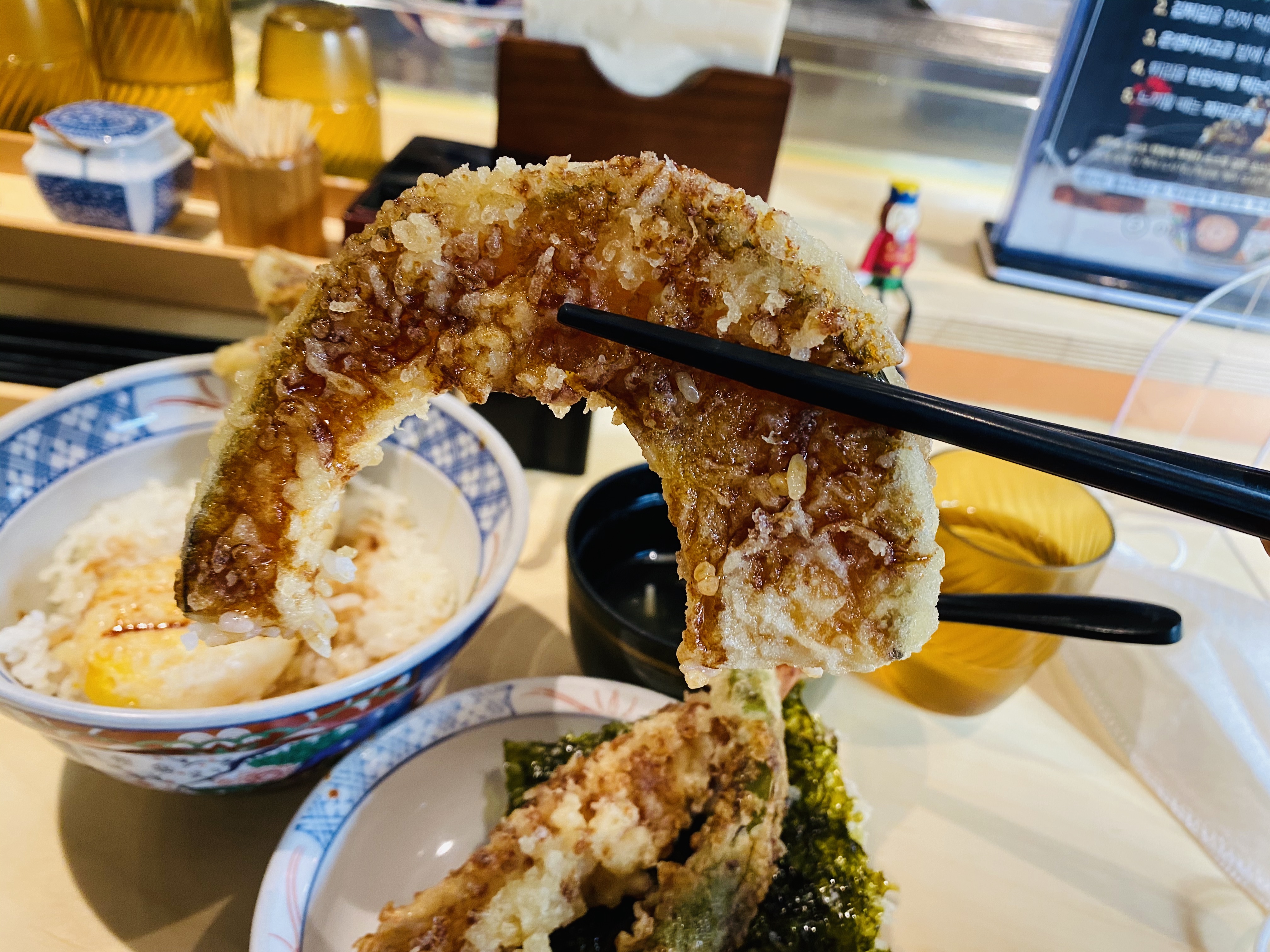 남편이 시킨 아나고텐동에 들어있던 기다란 장어 튀김이에요. 남편이 반 잘라주어 저도 맛을 봤습니다. 장어의 큰 뼈만 제외하고 잔가시와 껍질이 남아있는 채로 튀기기 때문에 엄청 고소했어요. 장어 튀김 한입 딱 먹는 순간, 이 곳이 왜 맛집인지 알게 됩니다.