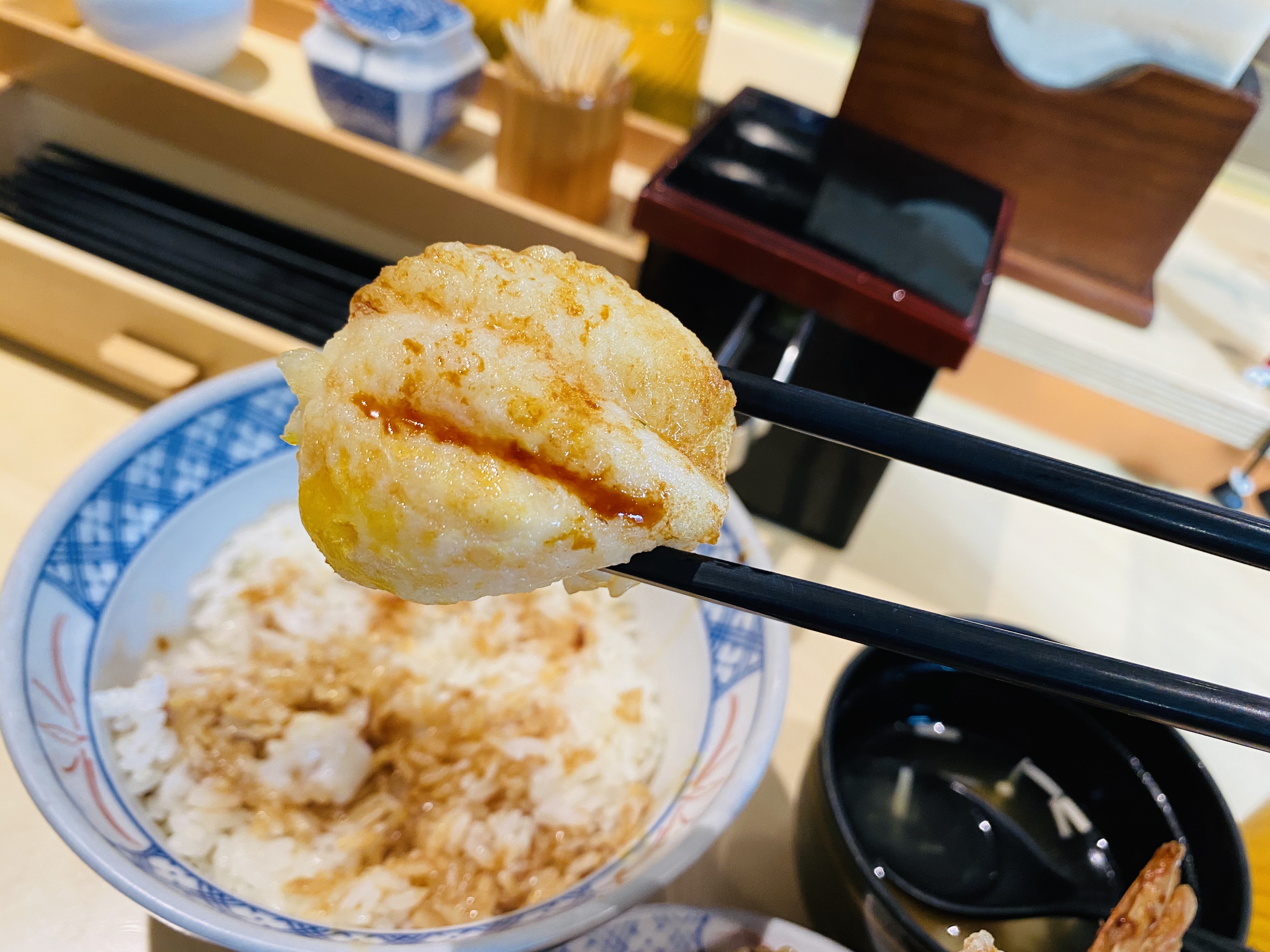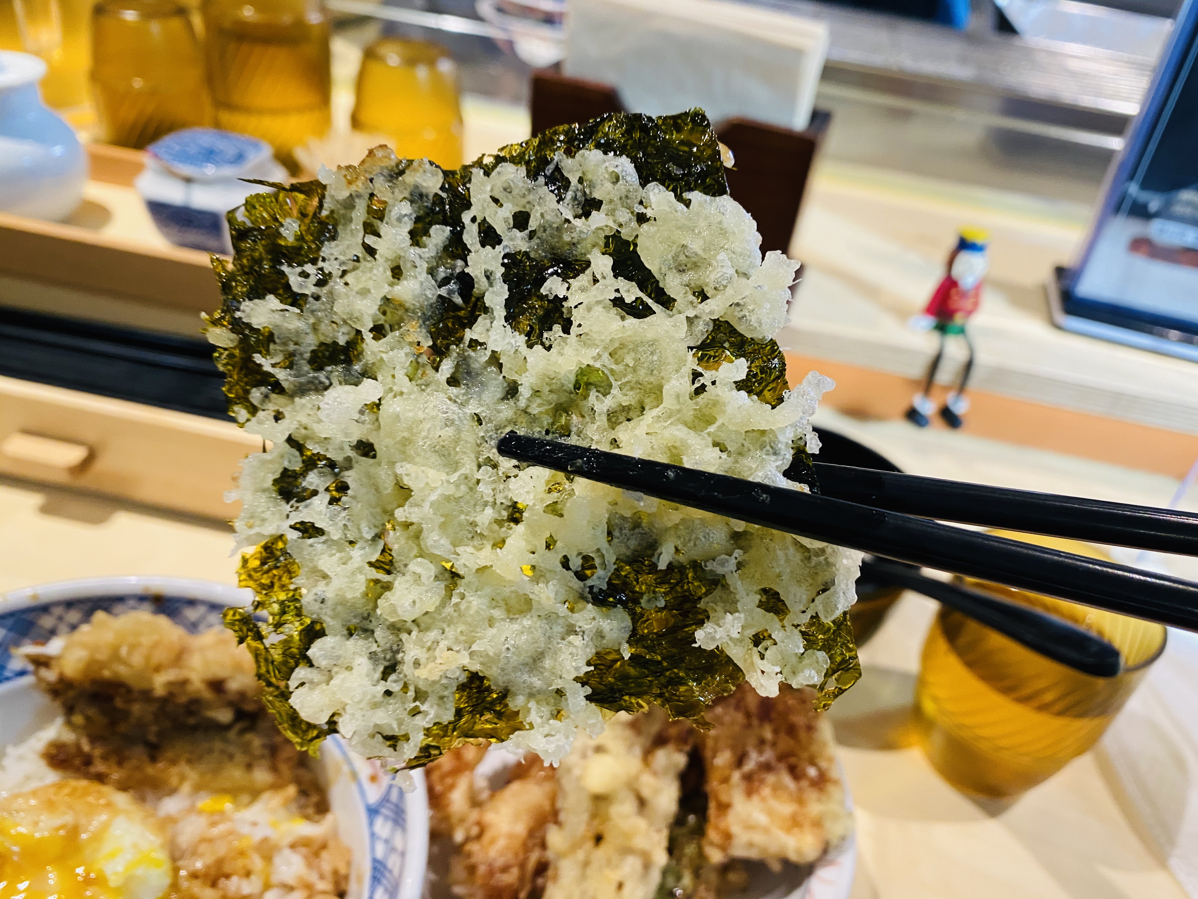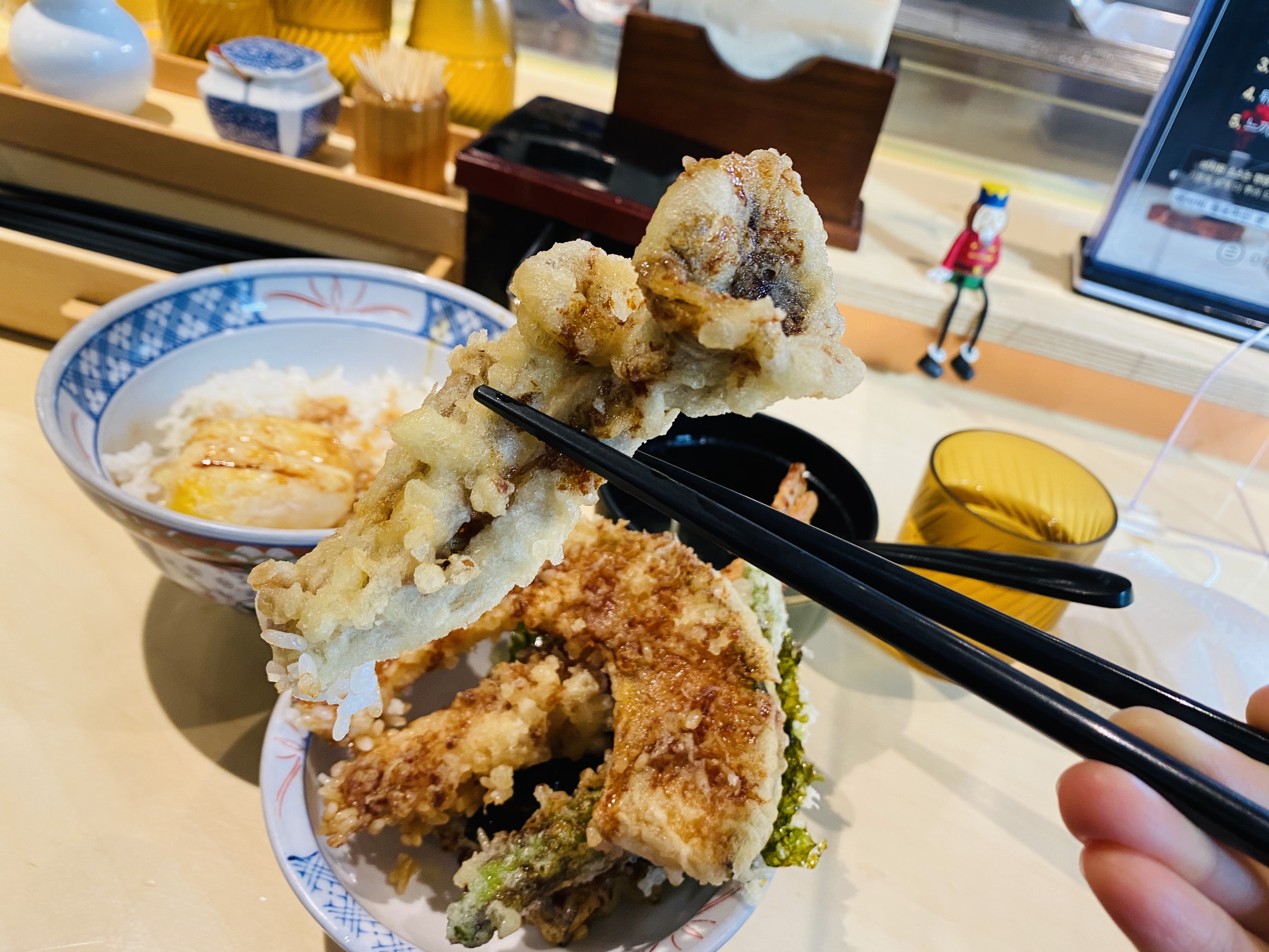 남편이 시킨 아나고텐동에 들어있던 기다란 장어 튀김이에요. 남편이 반 잘라주어 저도 맛을 봤습니다. 장어의 큰 뼈만 제외하고 잔가시와 껍질이 남아있는 채로 튀기기 때문에 엄청 고소했어요. 장어 튀김 한입 딱 먹는 순간, 이 곳이 왜 맛집인지 알게 됩니다.
