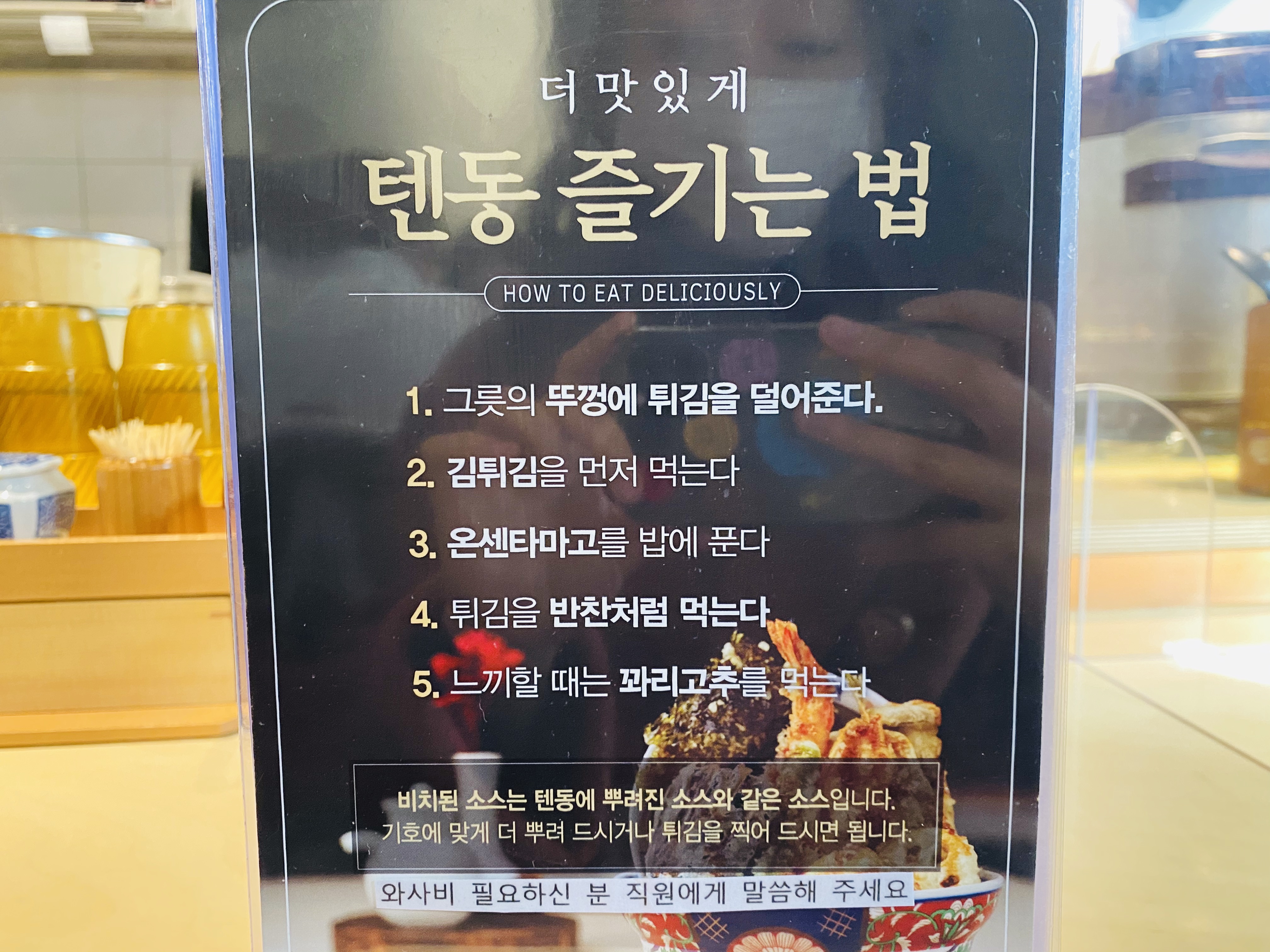 텐동이 나오기 전에 테이블에 있는 '맛있게 먹는 법'을 숙지해봅니다ㅎㅎ 뚜껑에 튀김을 다 덜고 온센타마고(반숙계란)을 밥에 푼 뒤, 튀김을 반찬처럼 밥과 함께 먹으면 된다고 하네요.