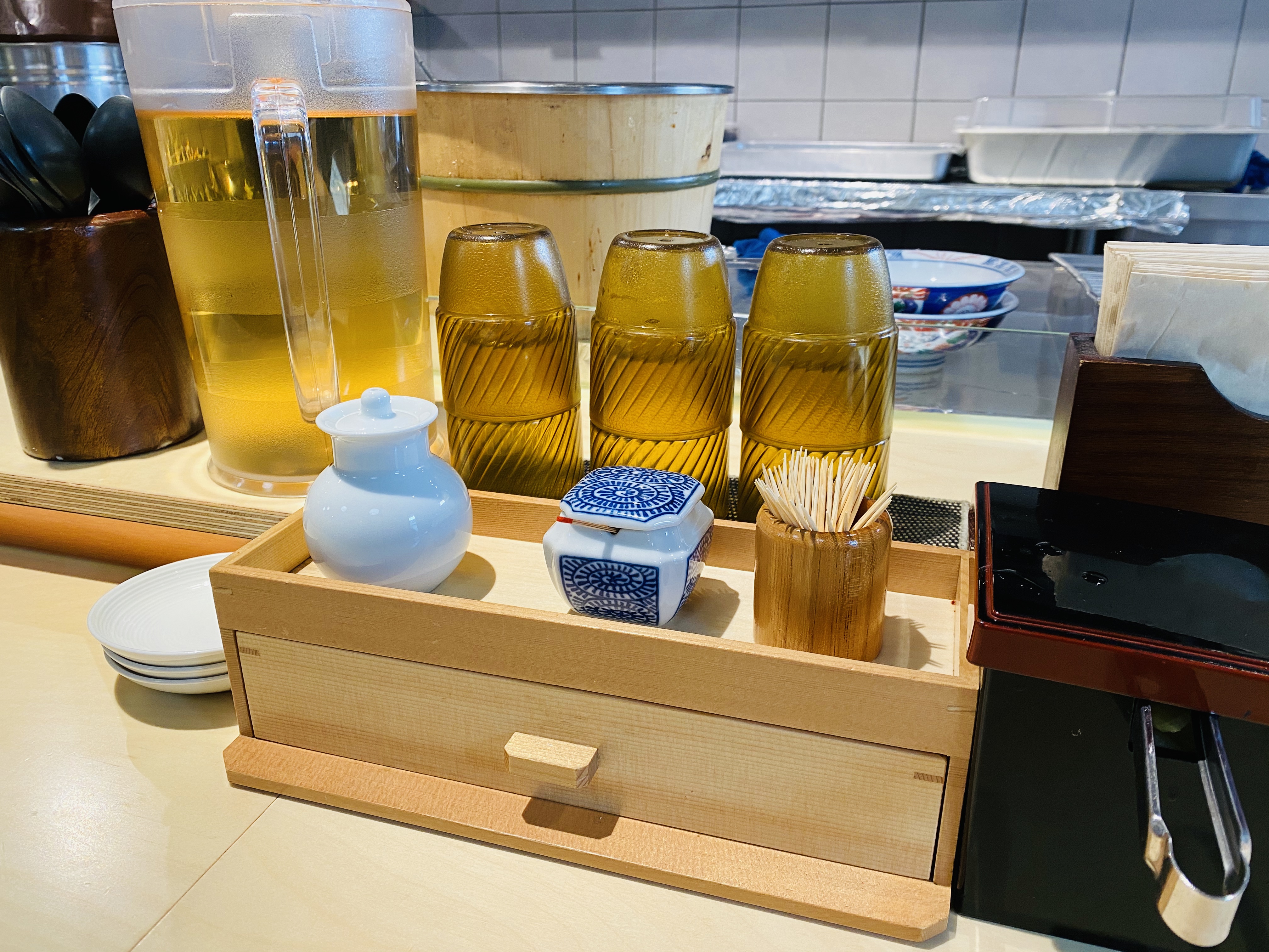 테이블마다 차, 젓가락, 간장, 단무지가 세팅되어 있습니다. 이 집은 차랑 단무지도 맛있더라고요. 물 대신 엄청 고소한 맛이 나는 찻물이 제공되고, 단무지도 유자 소스에 절여 굉장히 상큼한 맛이 나 튀김이랑 먹기에 아주 좋았습니다.
