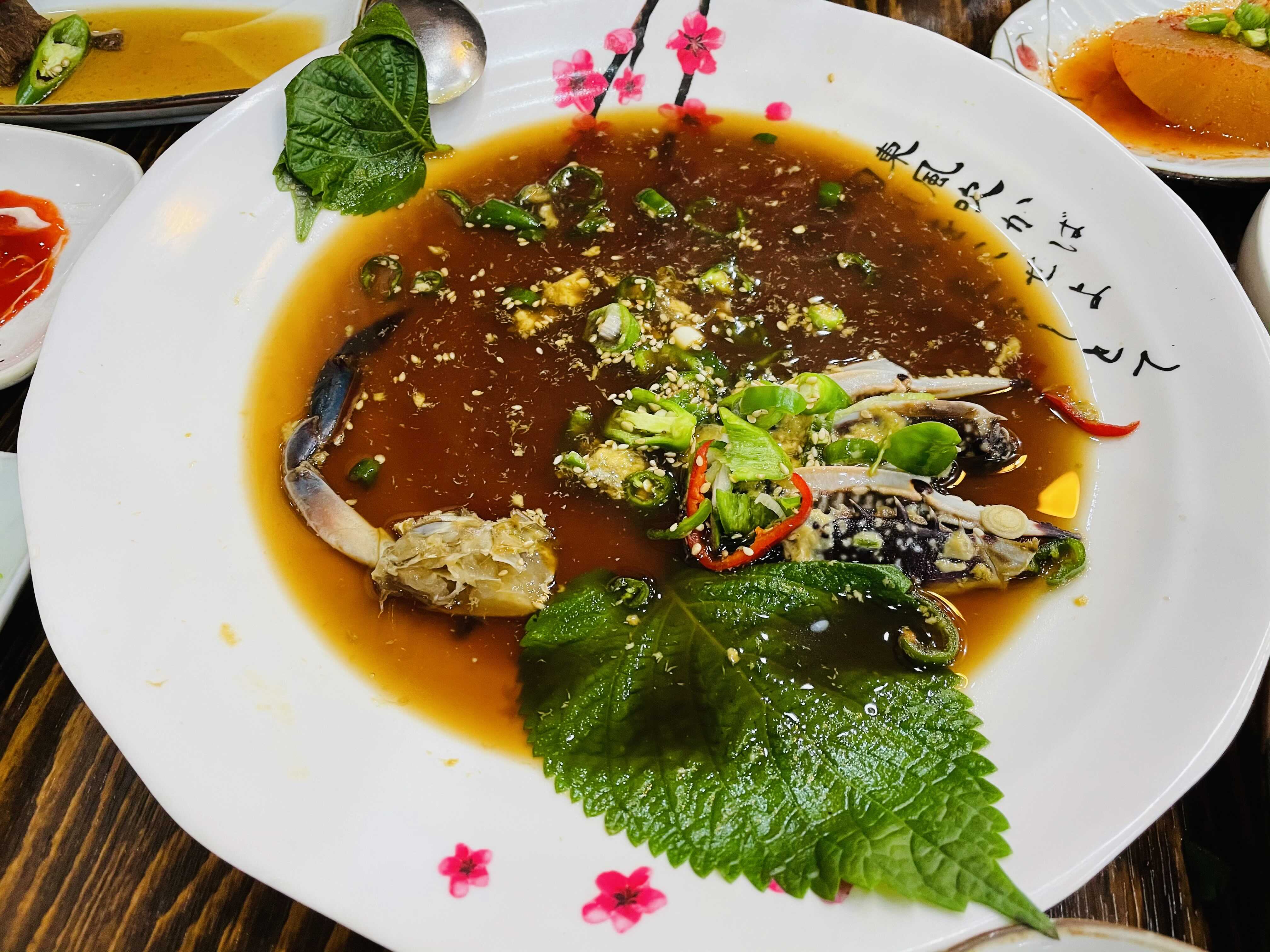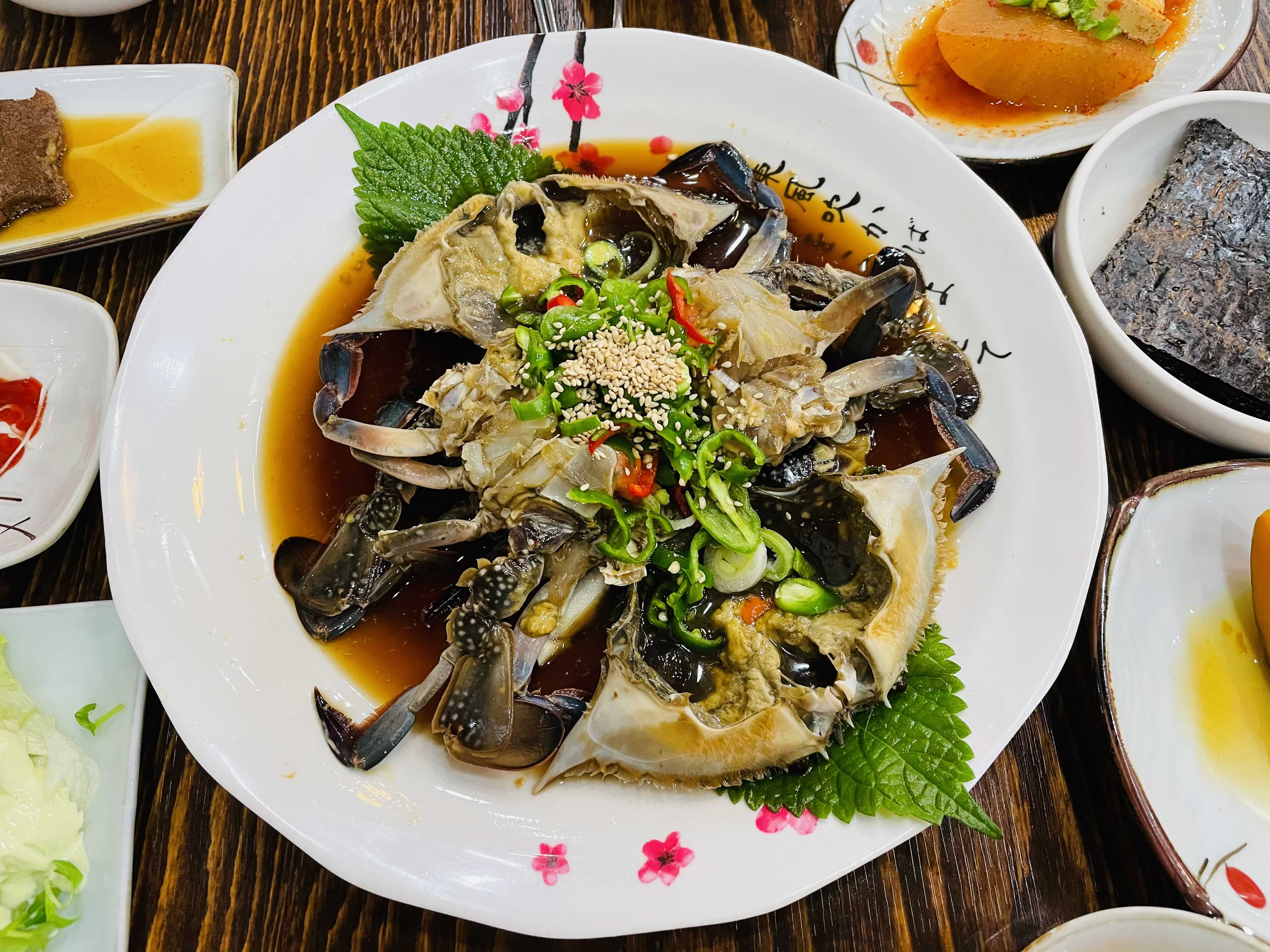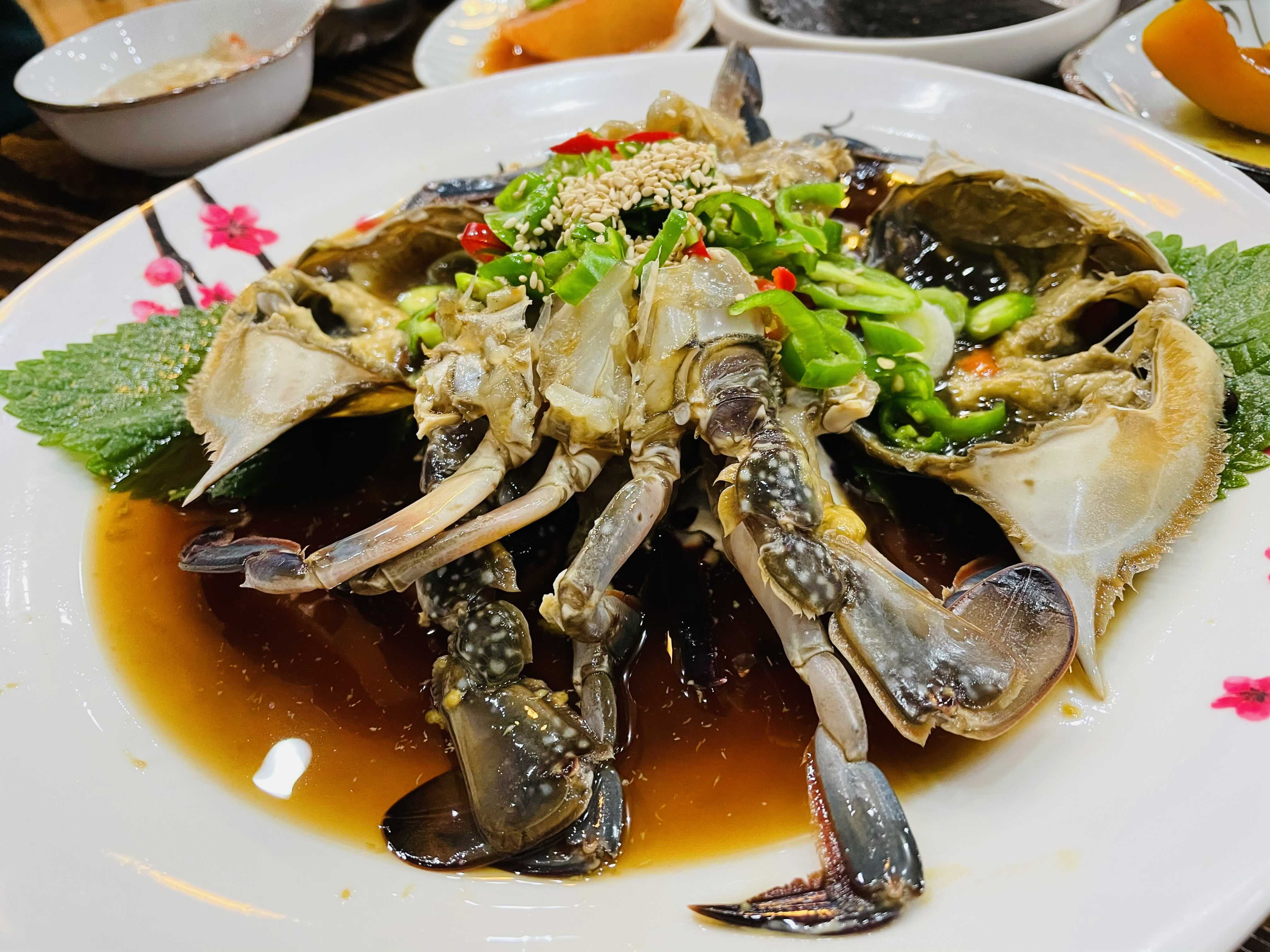 게장 비주얼부터 식욕을 확 당기네요. 신선한 간장 게장에 청고추 홍고추와 깨를 듬뿍 얹어 보기에도 맛있어 보여요.