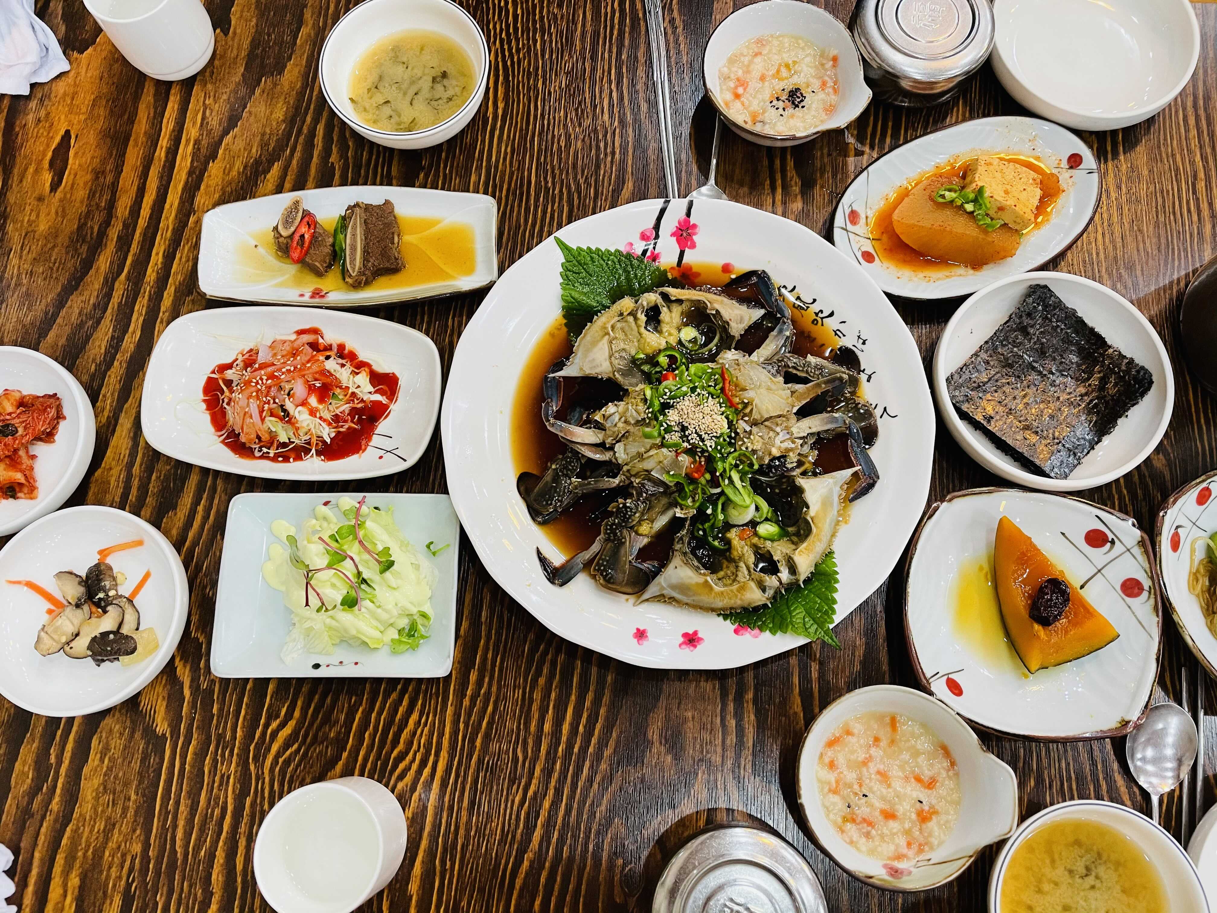 몇 분 안되어 게장과 각종 반찬들이 빠르게 이어 나왔어요. 푸짐해 보이는 한상이네요.