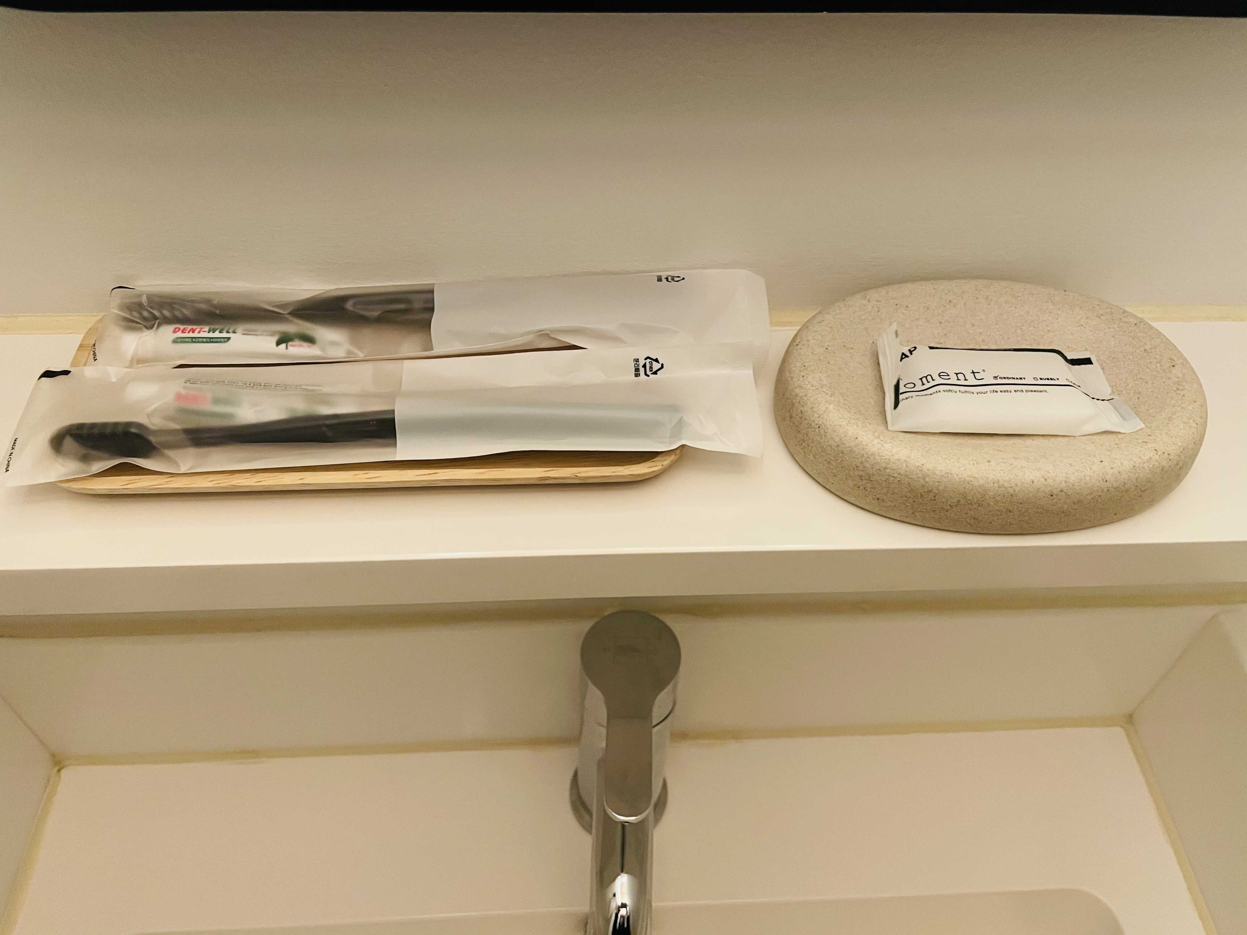세면대에는 치약, 칫솔, 비누, 드라이기 등 기본적인 세면 물품들이 구비되어 있습니다.