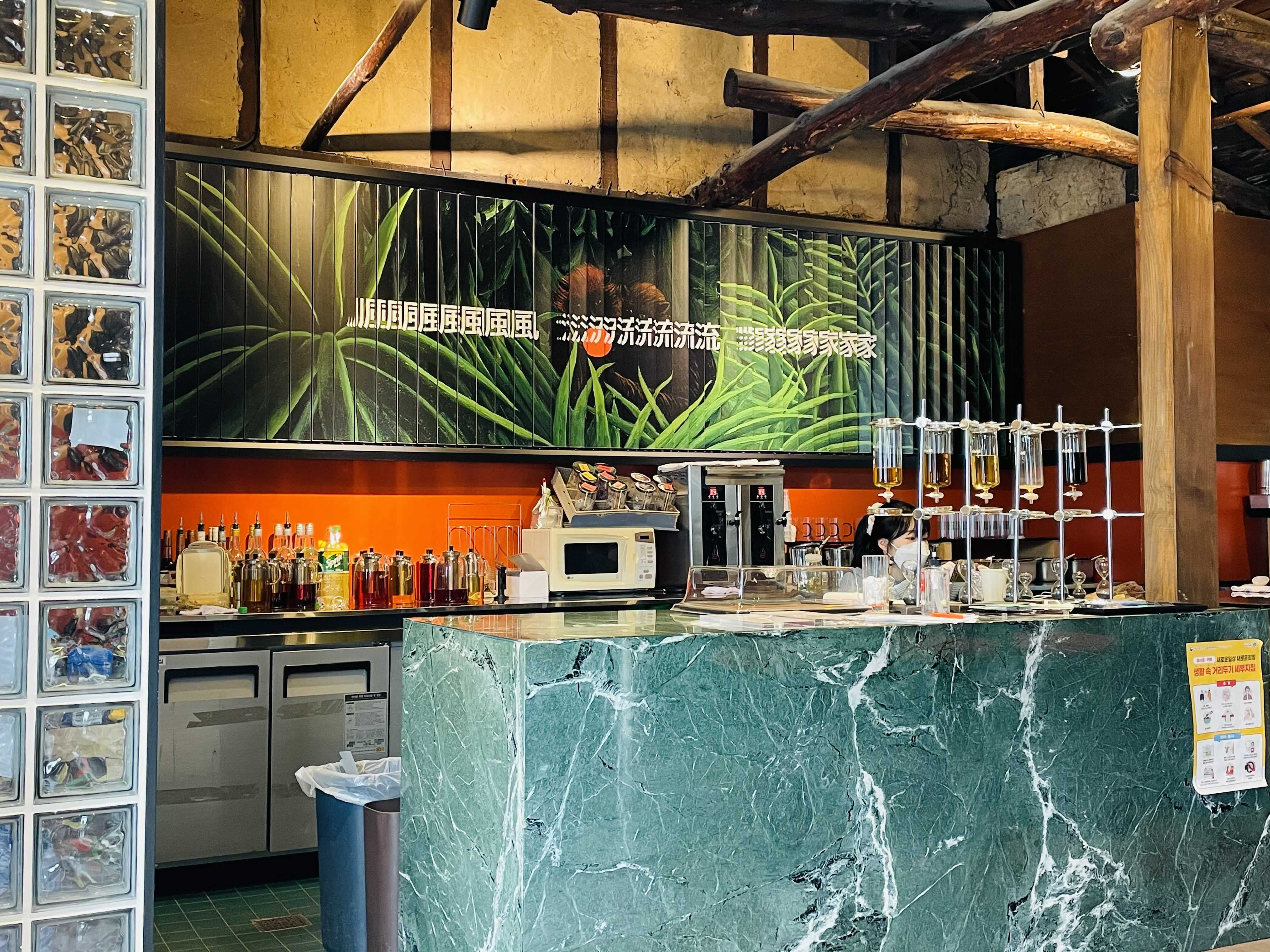 주방은 완전히 오픈되어 있는데, 주방 벽면을 장식하고 있는 정글 느낌의 풍뉴가 간판도 인상적이었어요.