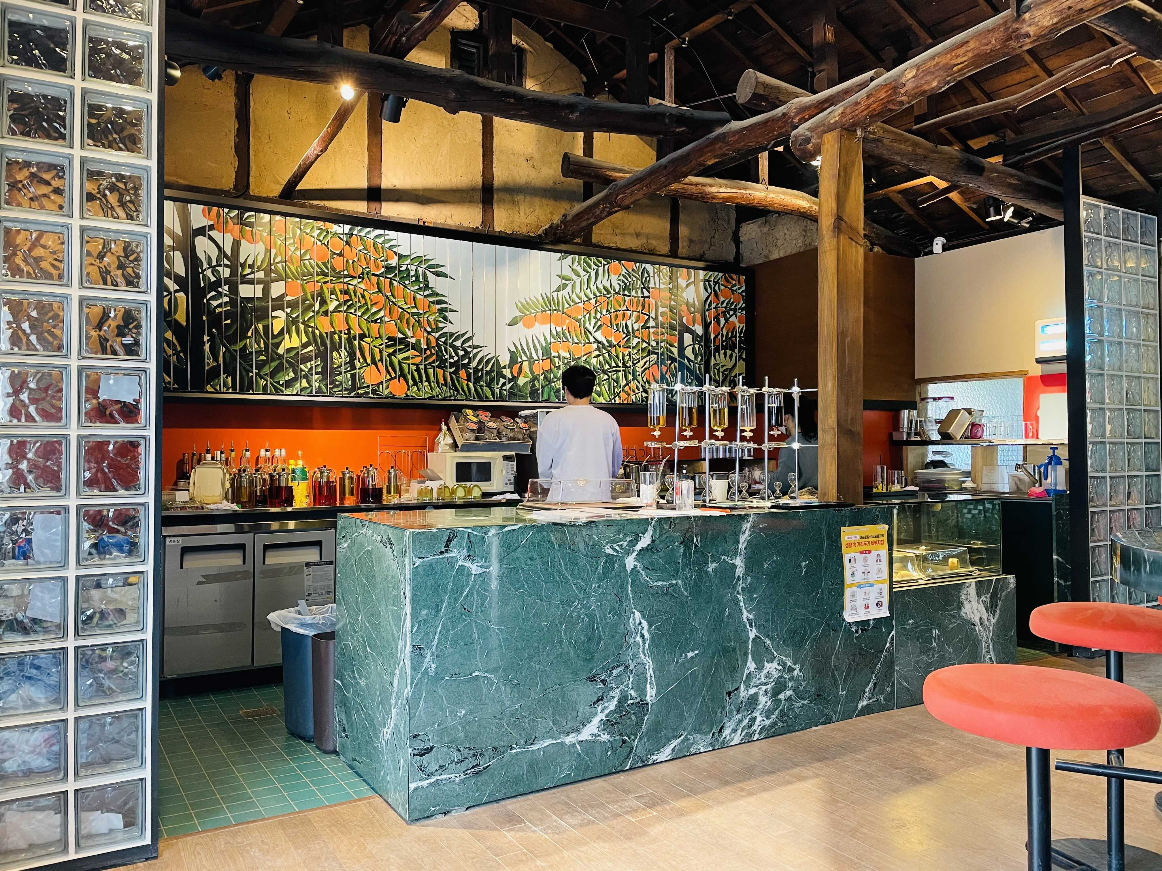 카페 내부로 들어오면 또 분위기가 완전 다릅니다. 오묘한 색감의 대리석, 금속 재질의 테이블, 채도 높은 주황색 의자들이 독특한 분위기를 연출합니다.