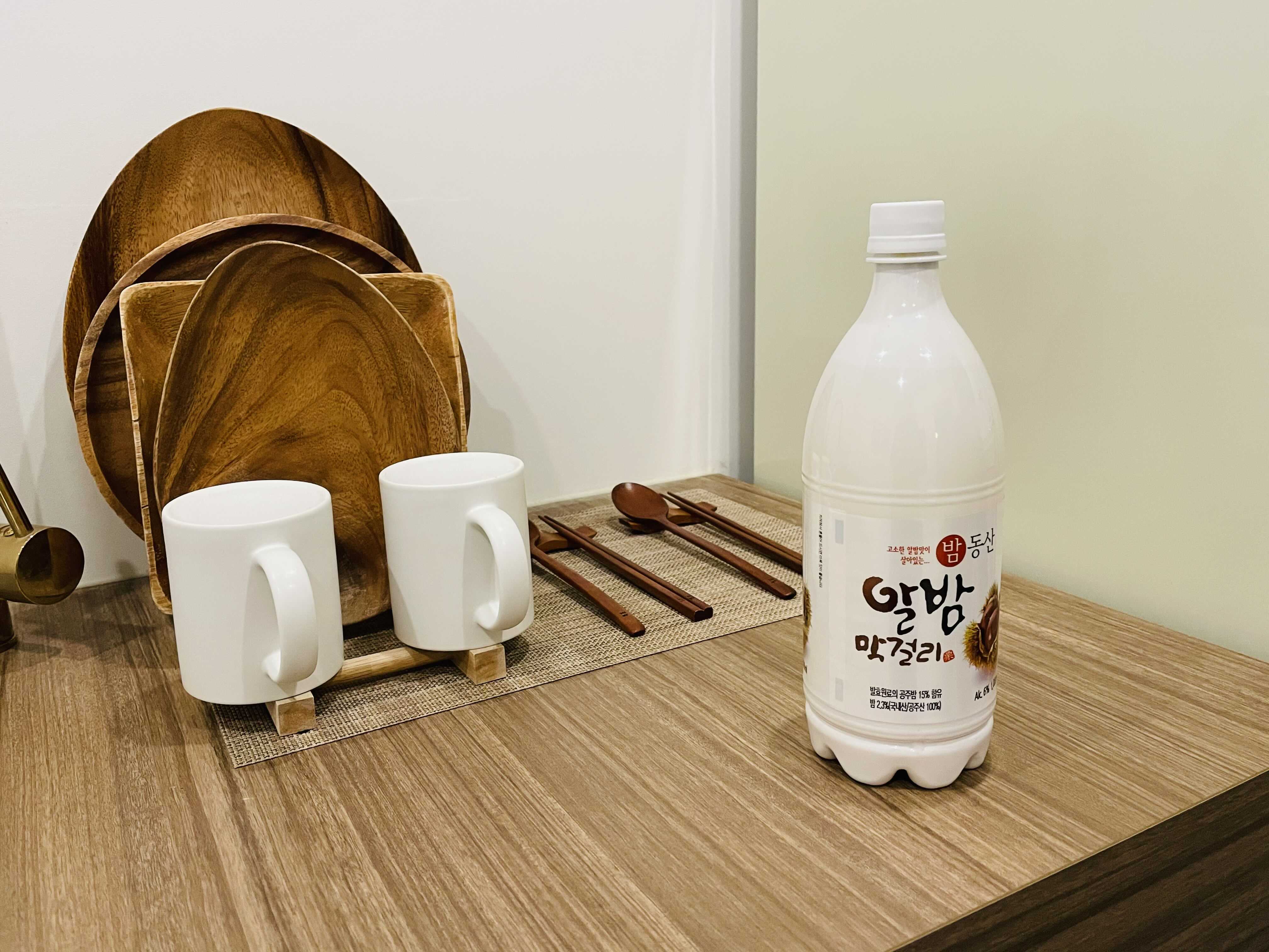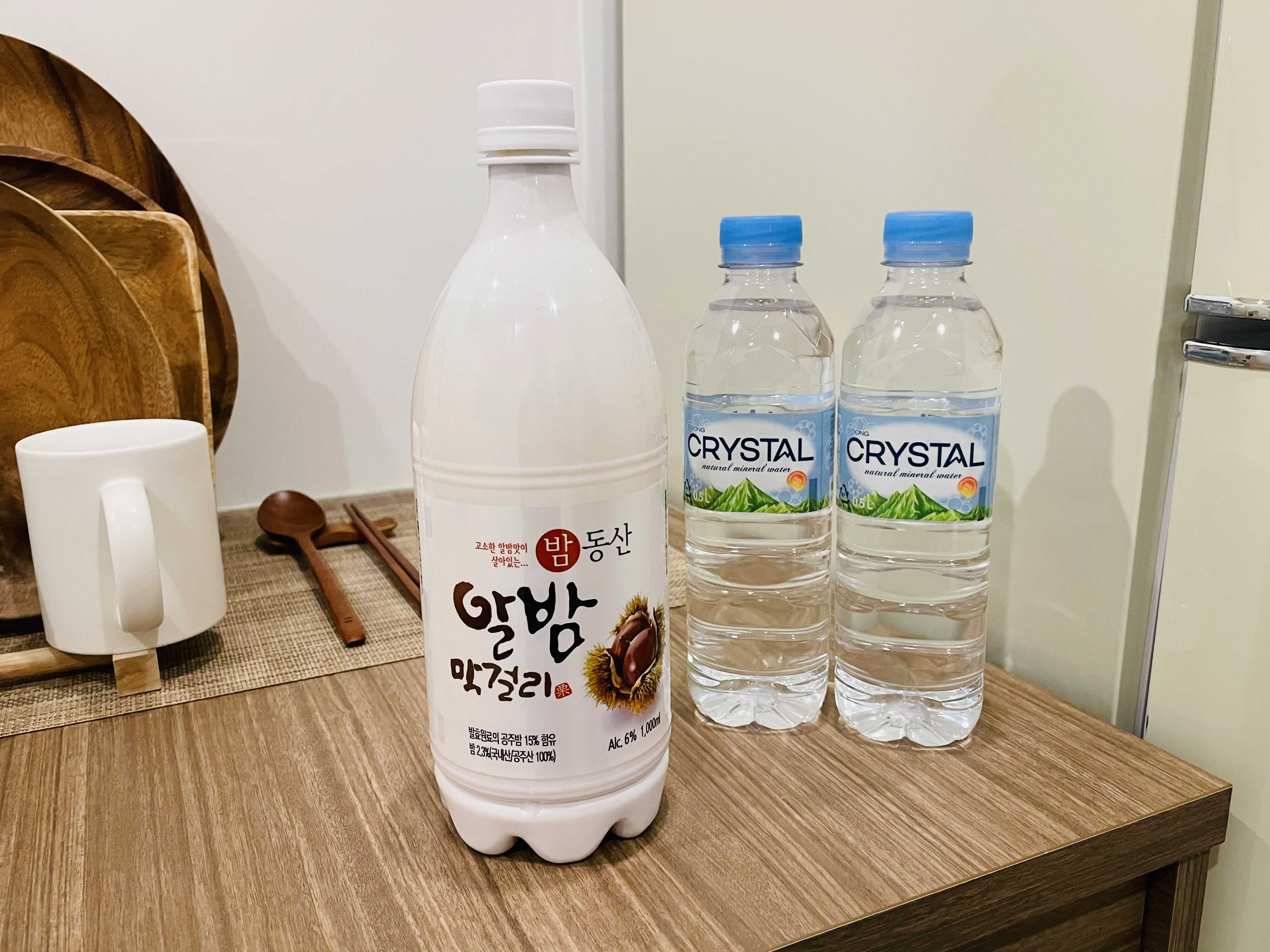 냉장고에는 생수 2병이 들어있고, 사장님이 맛보기 하라고 알밤 막걸리도 한 병 넣어주셨네요ㅎㅎ