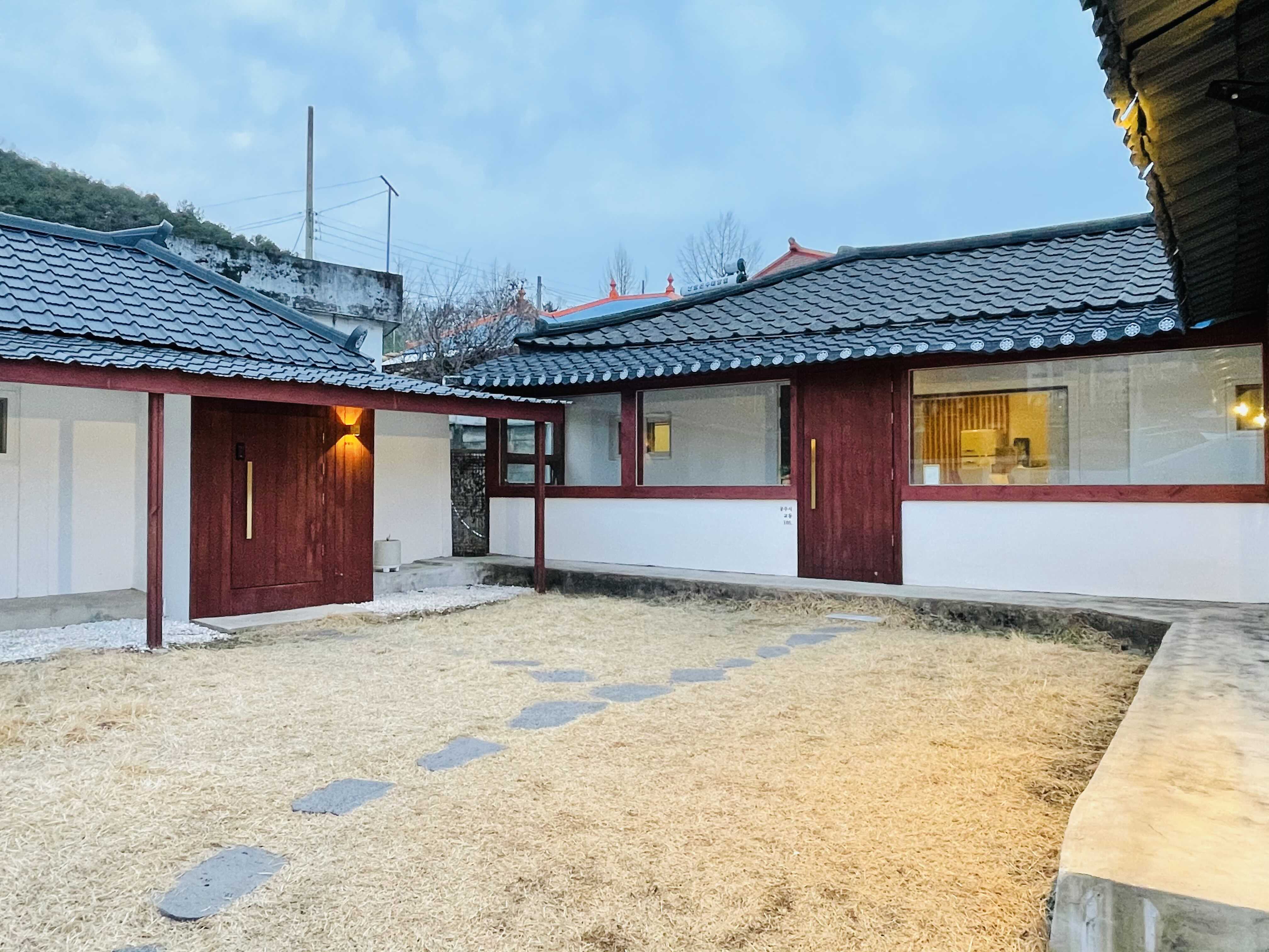짙은 기와색 지붕, 하얀 벽, 그리고 와인색 문과 금색 문손잡이가 인상적이었어요. 전구색 조명들 덕분에 더욱 감성적이어 보이네요.