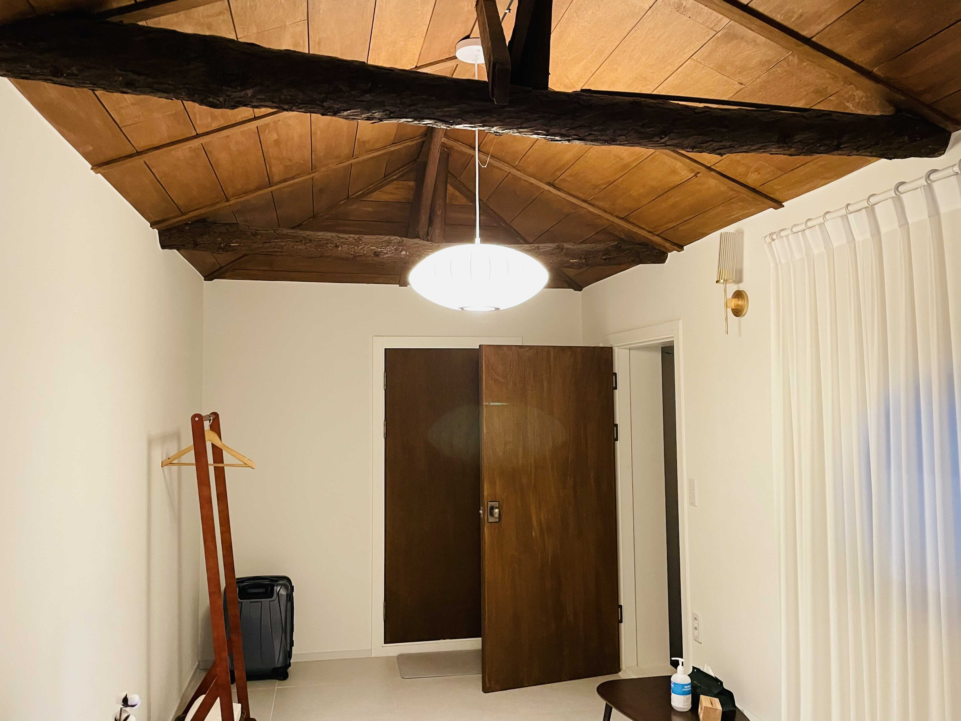 기와 지붕을 따라 대각선으로 만나는 천장과 한지 질감의 간접 조명으로 깔끔하면서도 아늑하게 꾸며놨어요.
