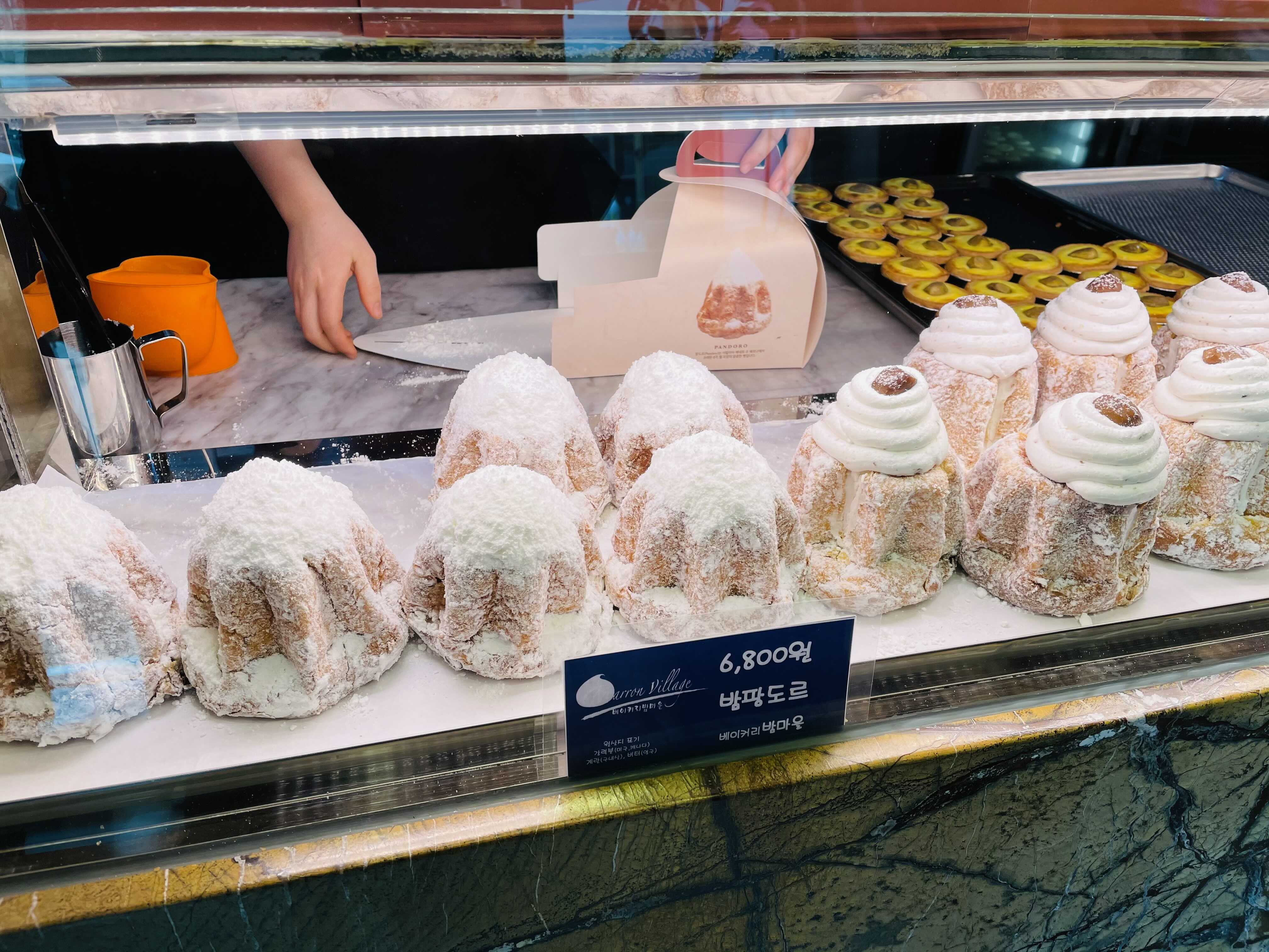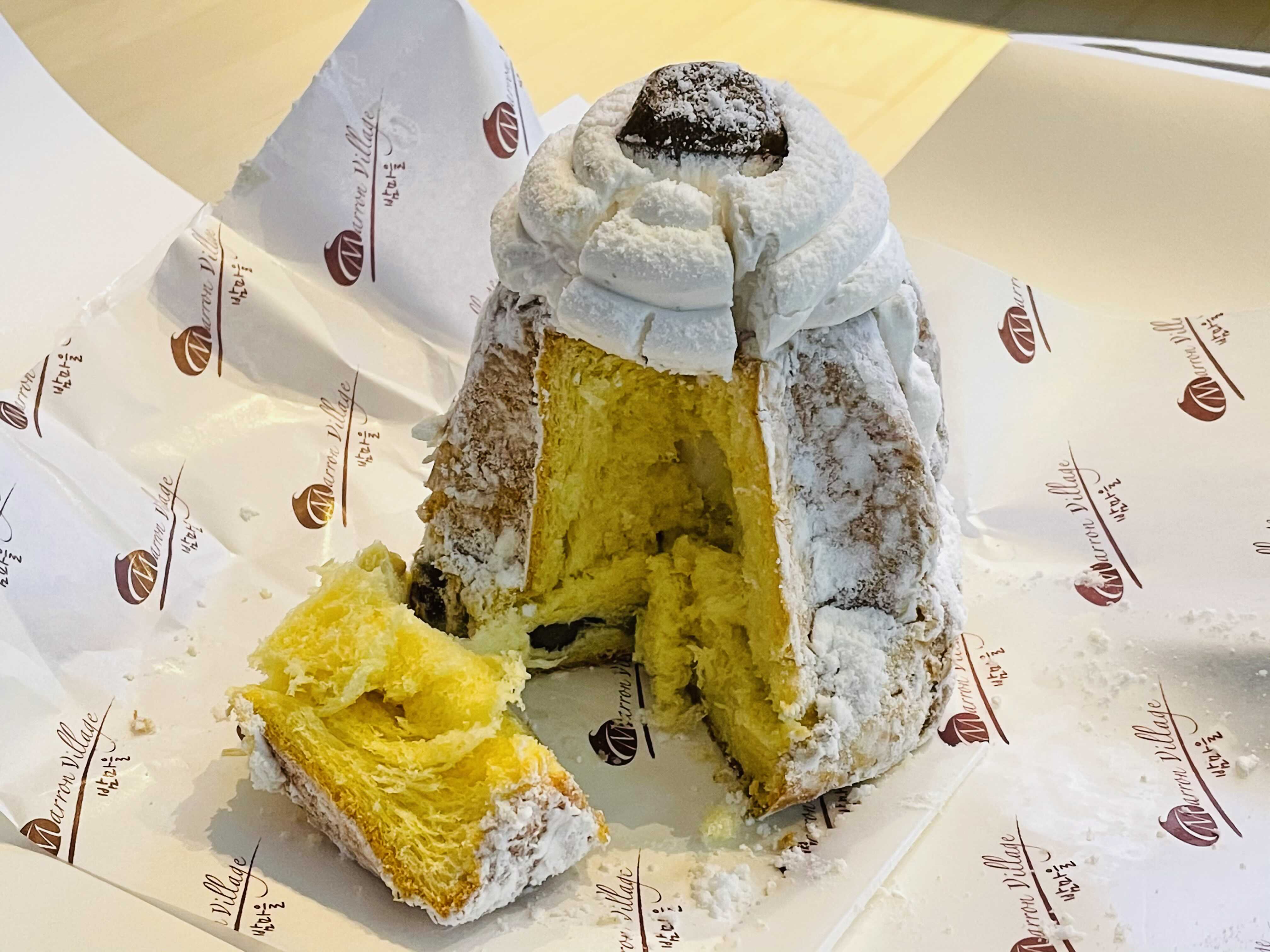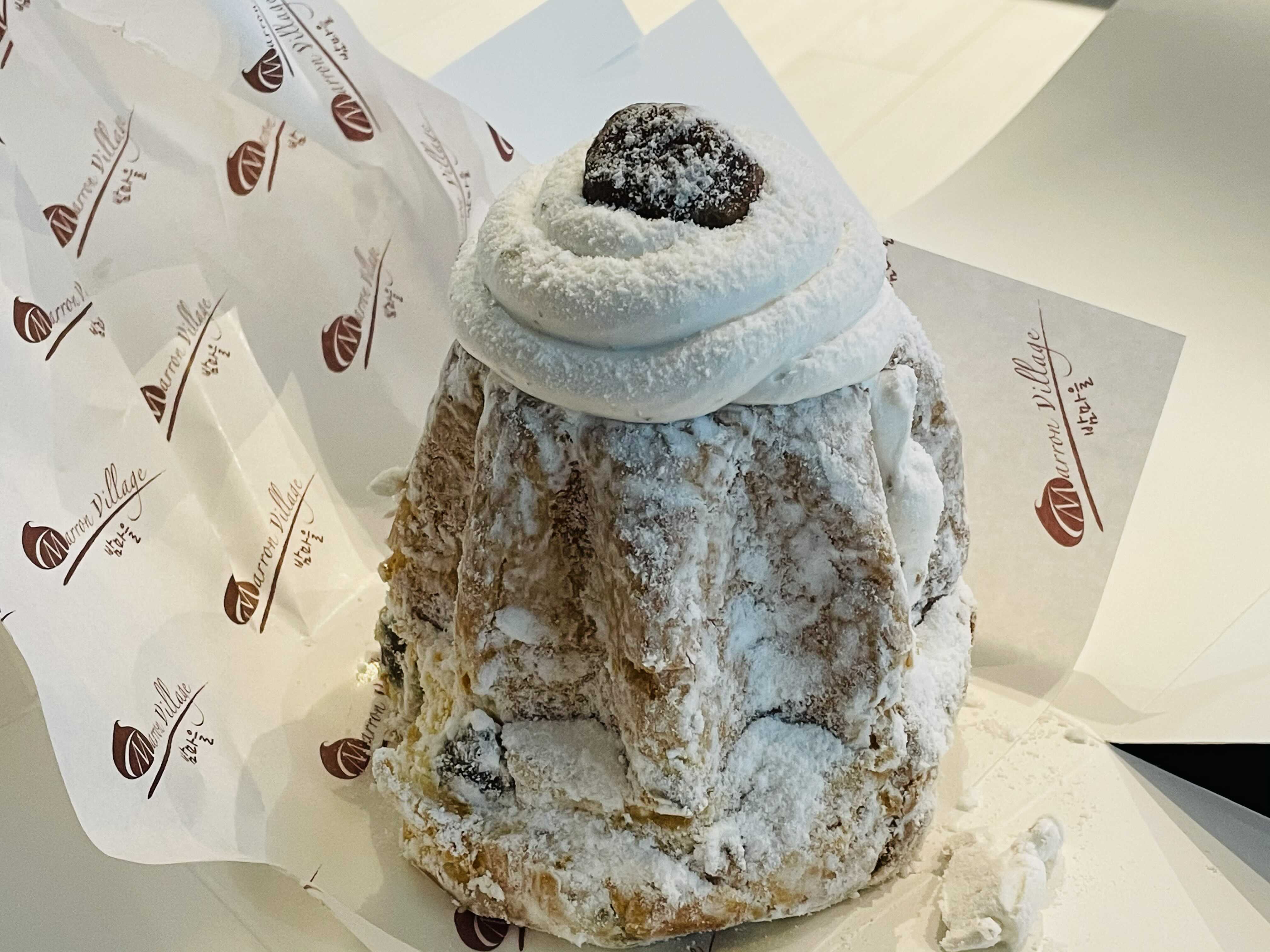 팡도르는 팔각 별 모양의 달콤하고 부드러운 빵을 일컫는데, '밤의 여왕'은 이 팡도르에 밤 조각이 군데군데 박혀있고 샹티 크림 가득 올라간 빵이에요.