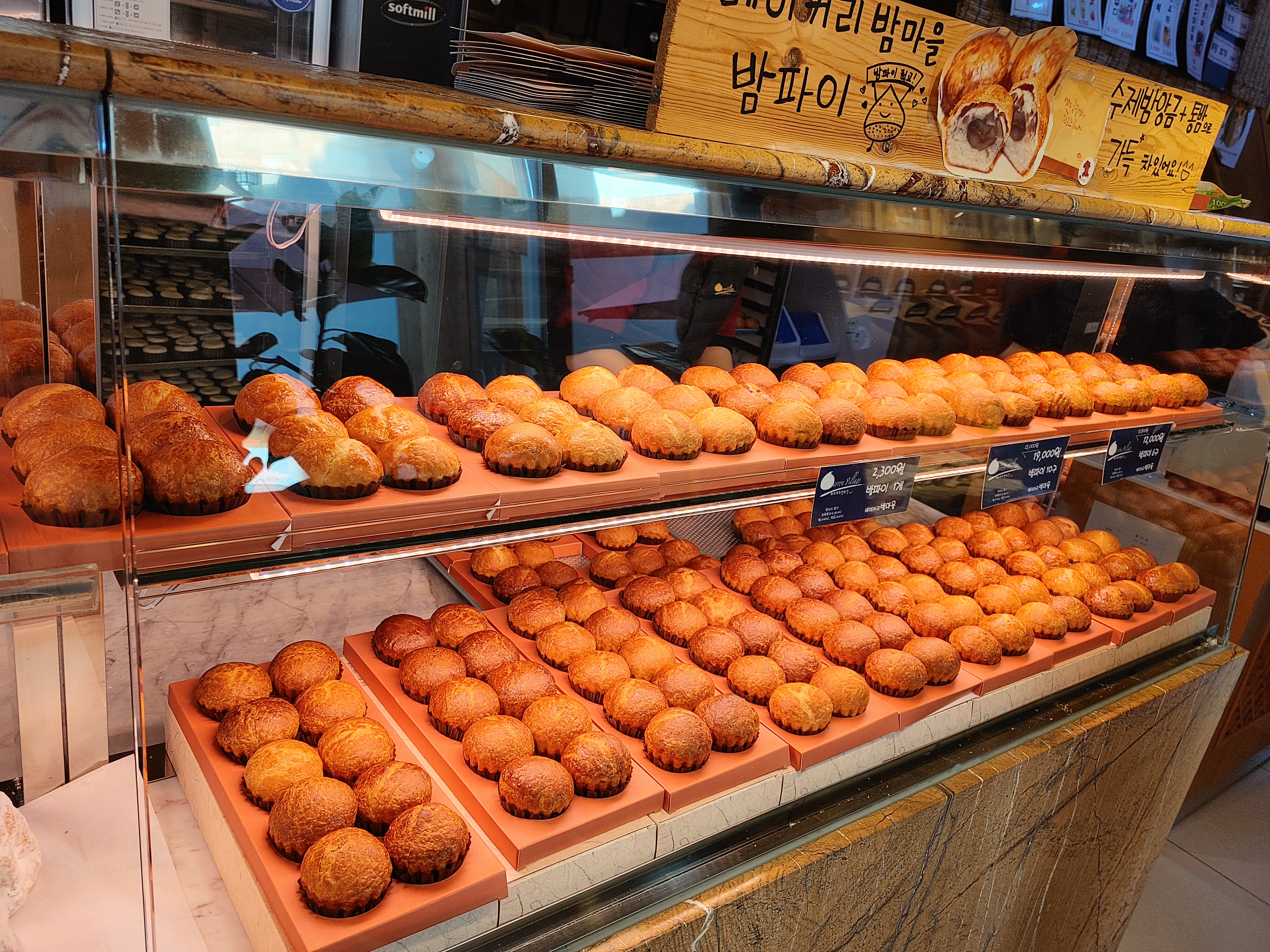 카페 안에 들어가면 제일먼저 베이커리 밤마을의 대표 빵인 '밤파이(2,300원)'를 왕창 구워놓은 모습을 볼 수 있습니다. 세트로 구입하면 6개 12,000원, 10개 19,000원으로 더 저렴해요. 겉은 바삭해 보이고 속이 가득 차서 빵빵해 보이는 모습이 식욕을 자극해요. 밤마을에 들르셨다면, 다른 건 몰라도 이건 꼬~옥 맛보셔야 해요.