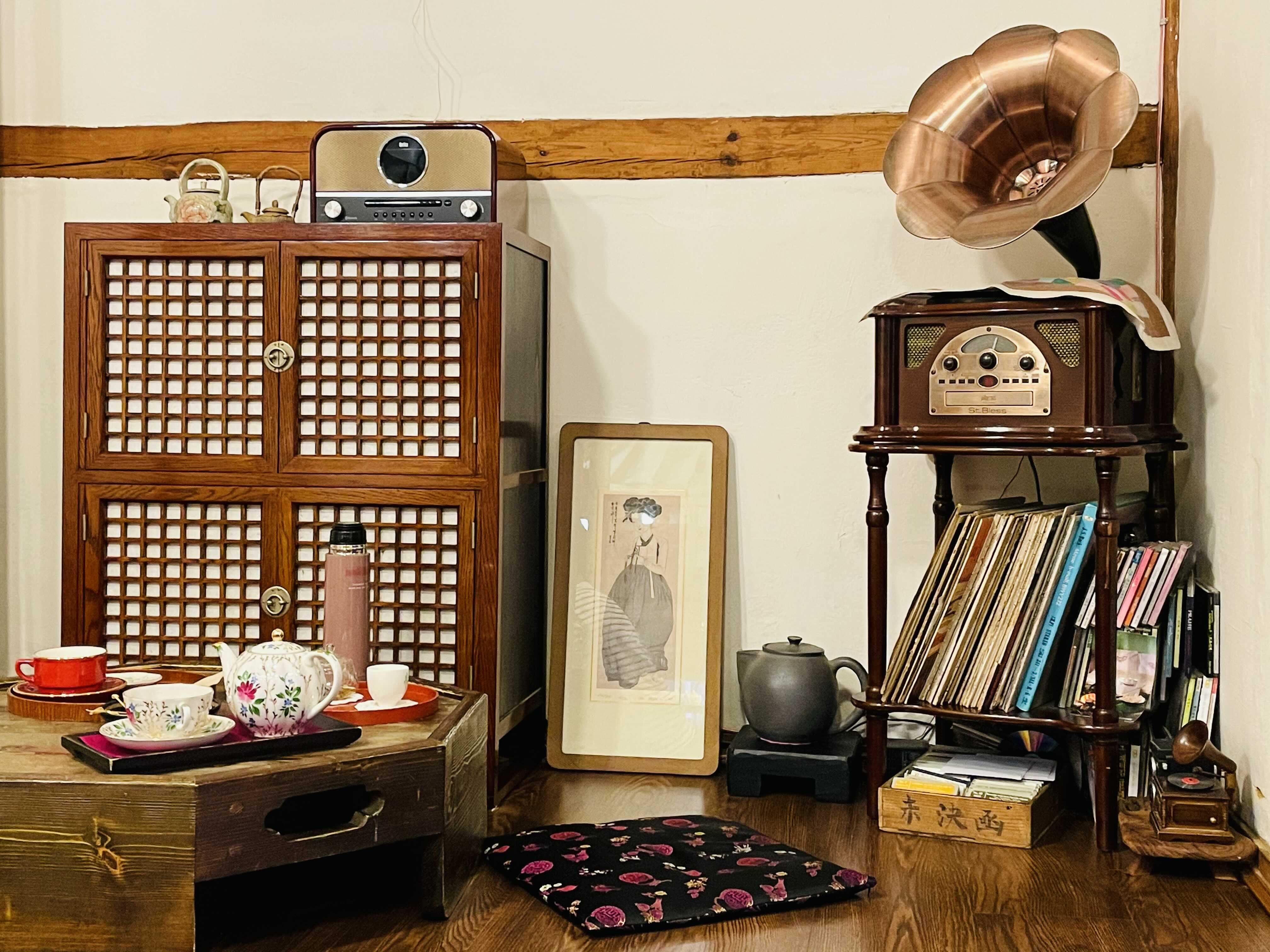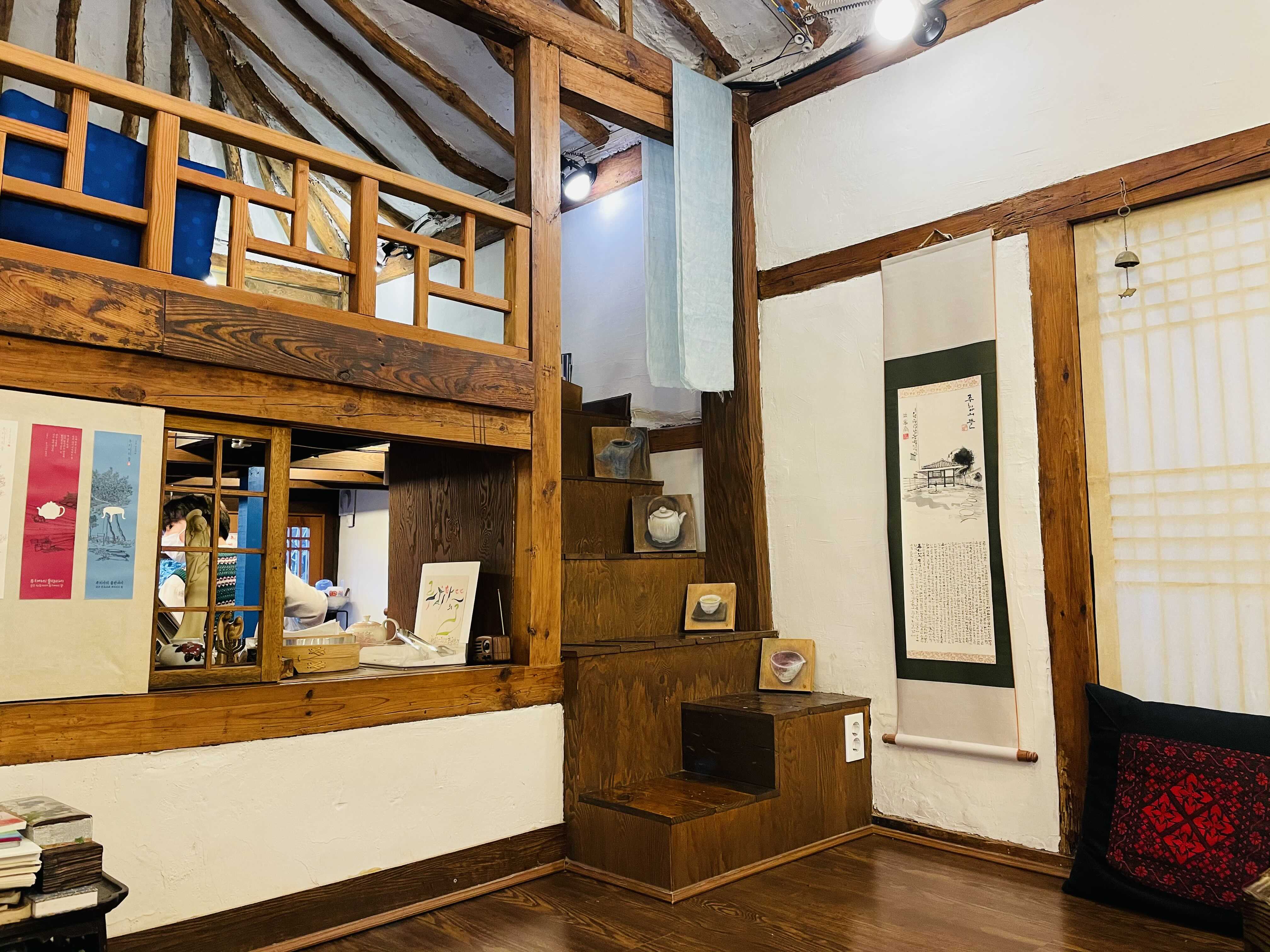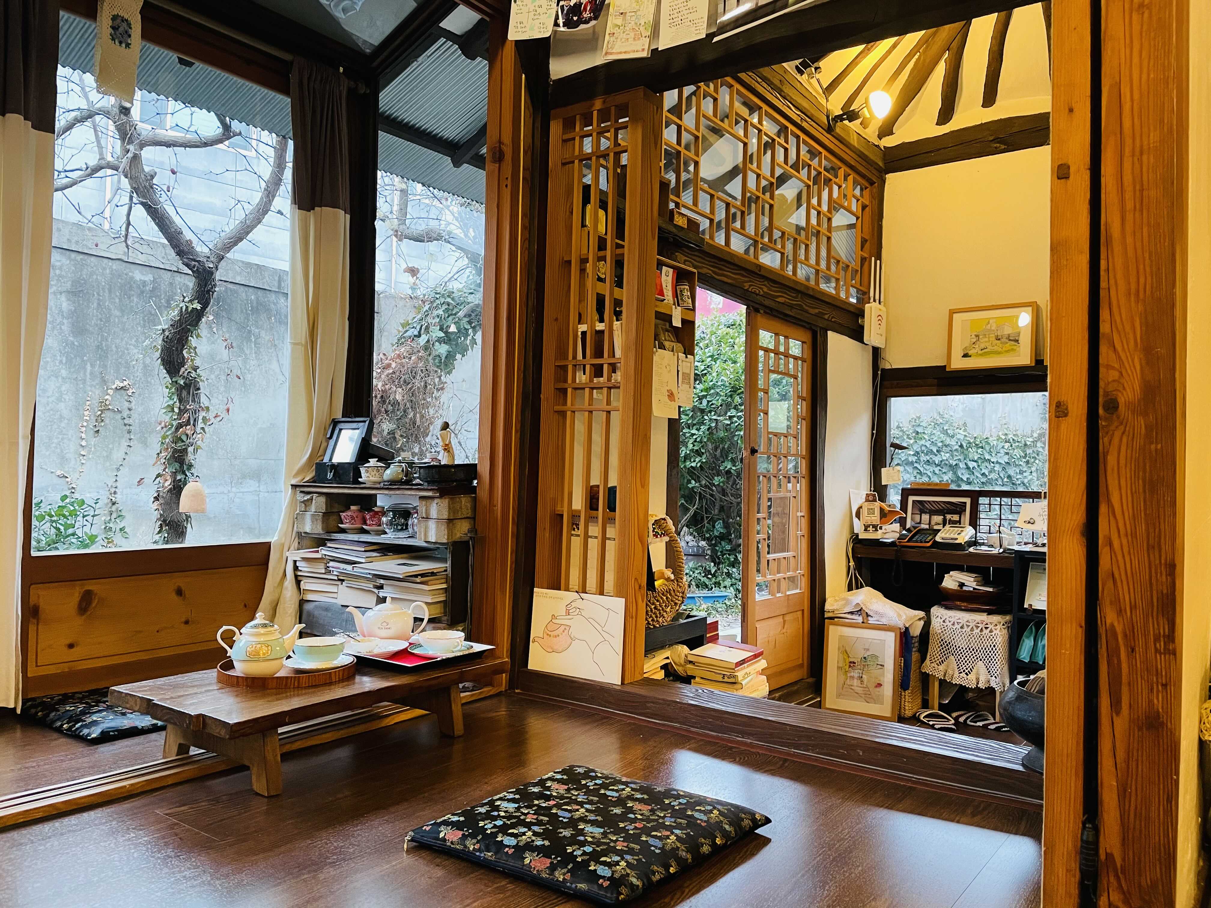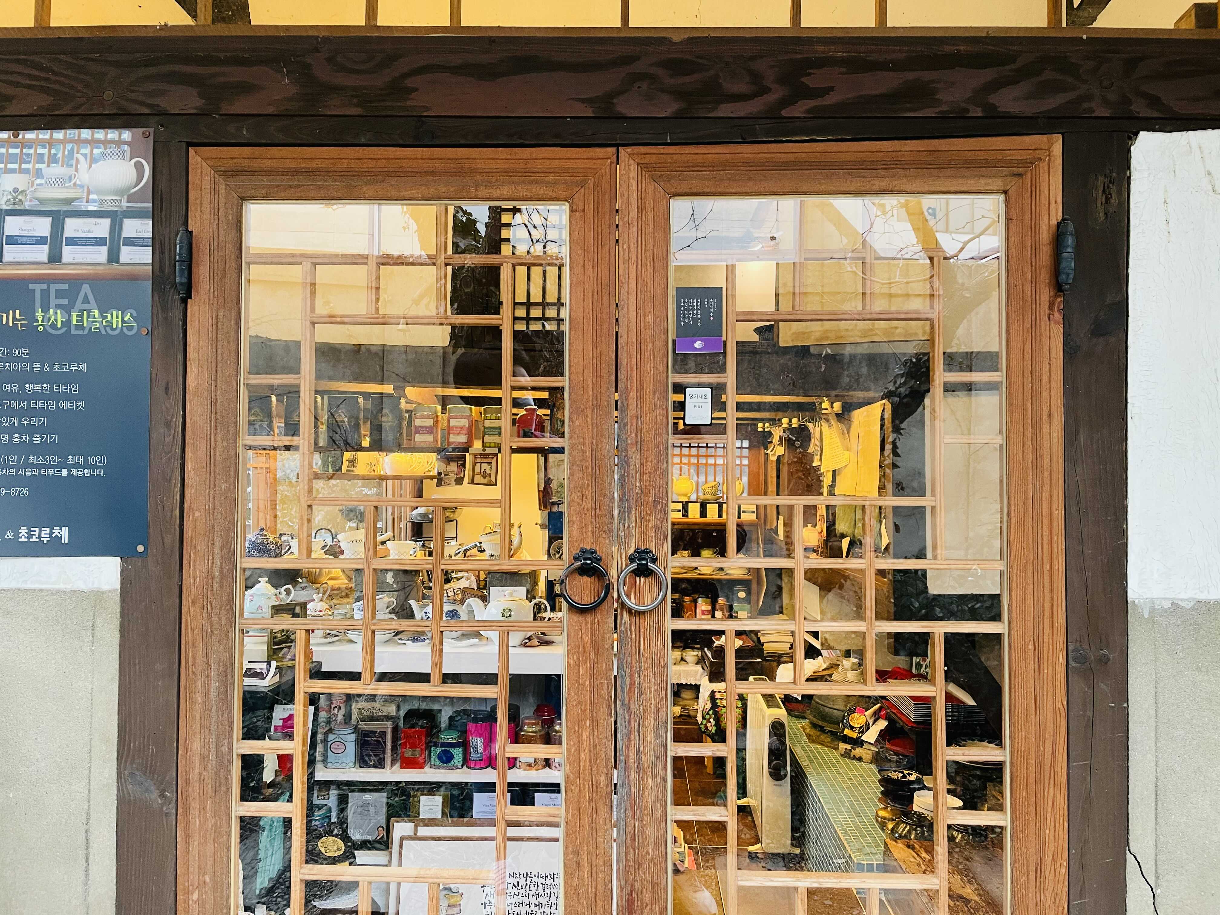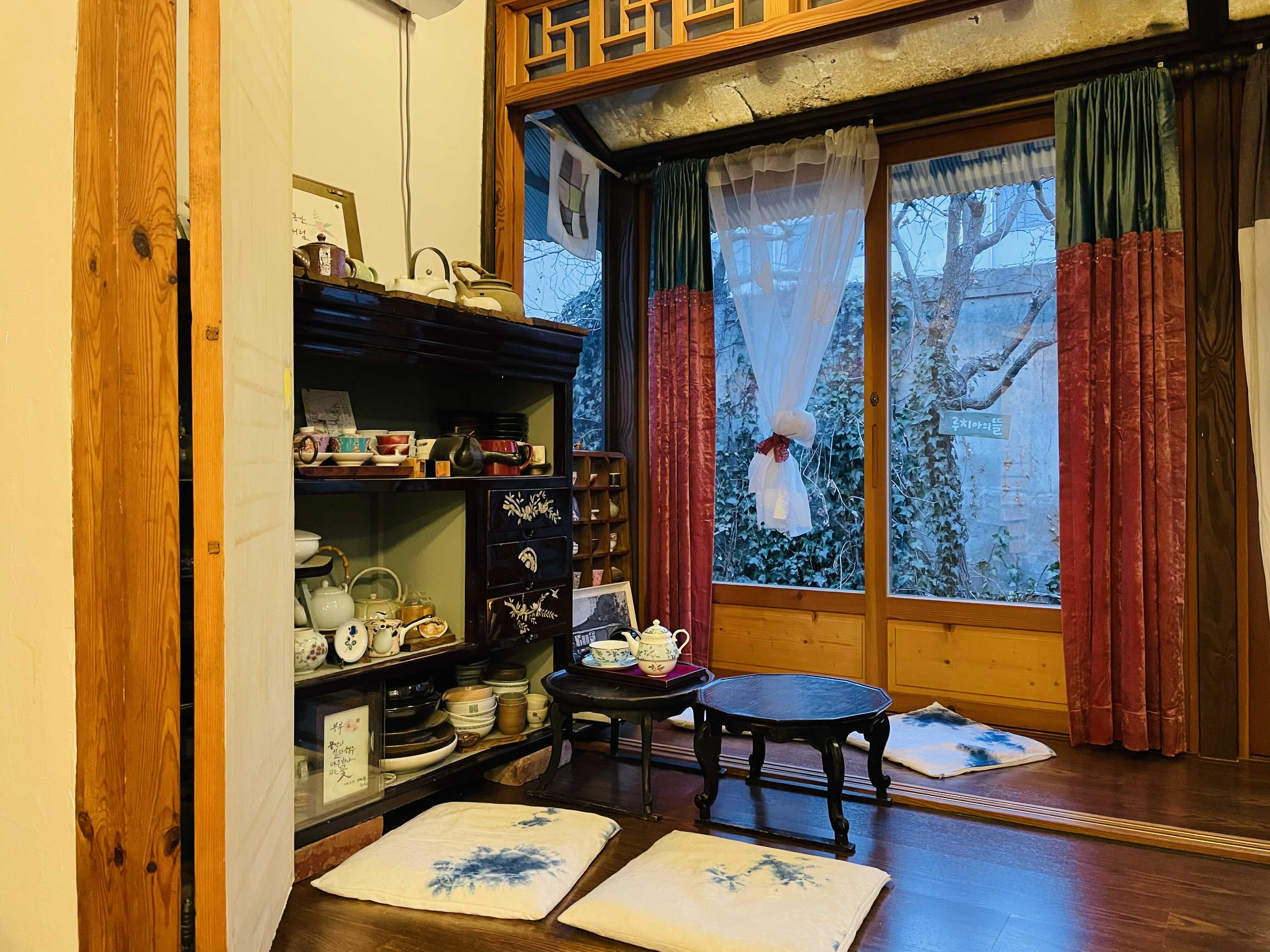 전통 가구들과 근대 소품들이 가득해서 볼거리가 많았어요. 선반에는 사장님이 모아둔 많은 찻잔들도 보입니다.