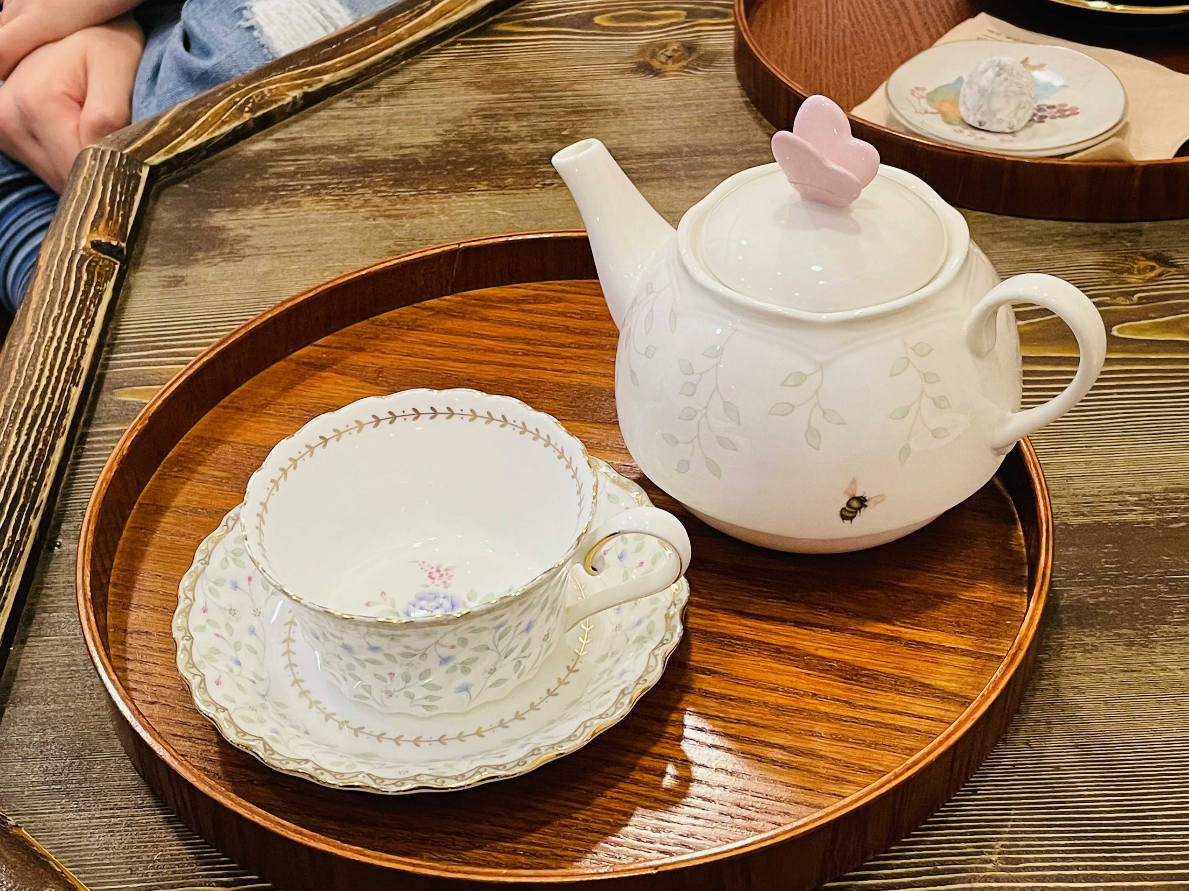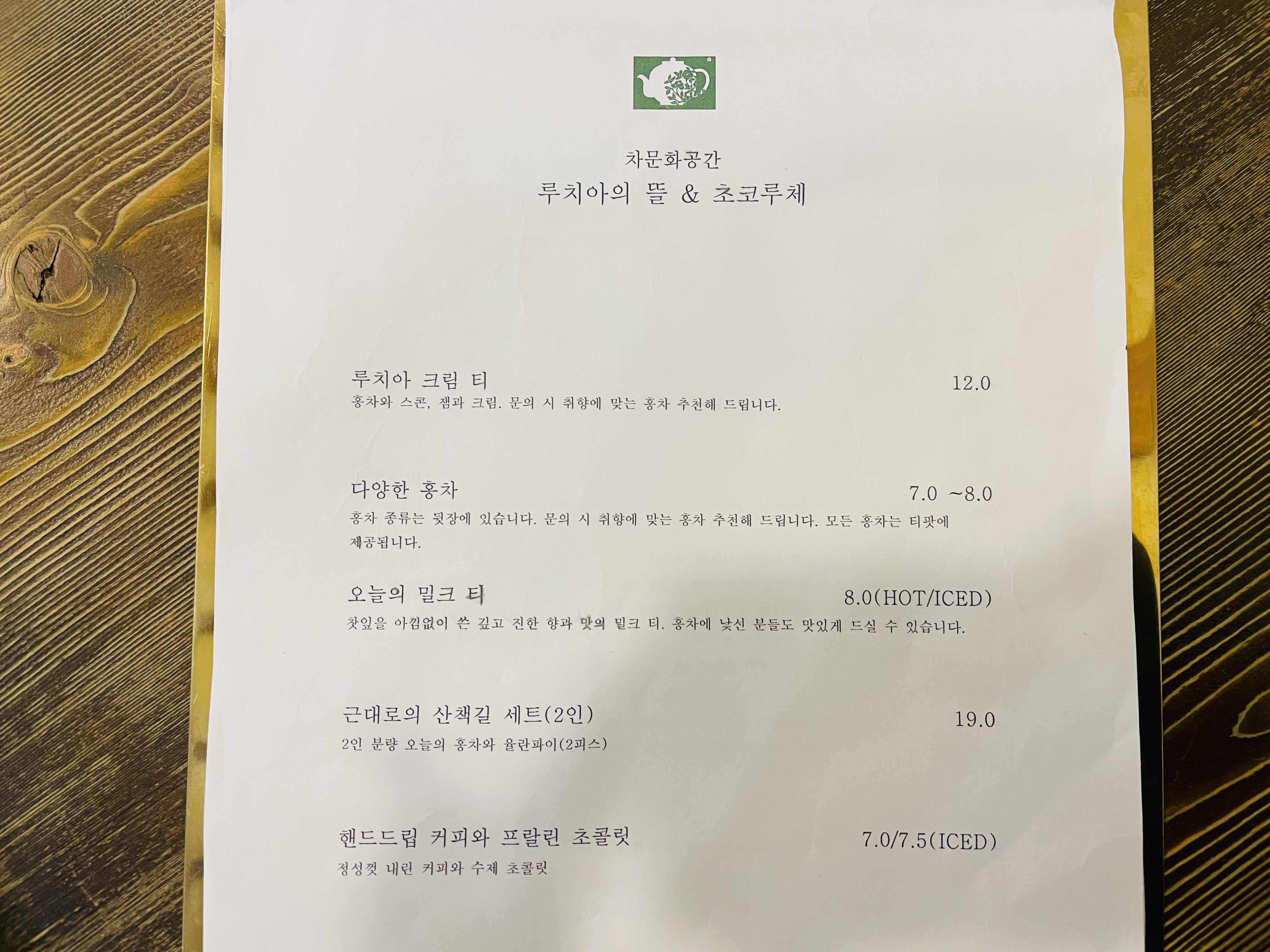 카페의 메인 메뉴는 홍차, 밀크티, 핸드드립 커피이고, 가격은 7~8,000원대예요. 음료와 함께 곁들일 티푸드도 준비되어 있습니다.