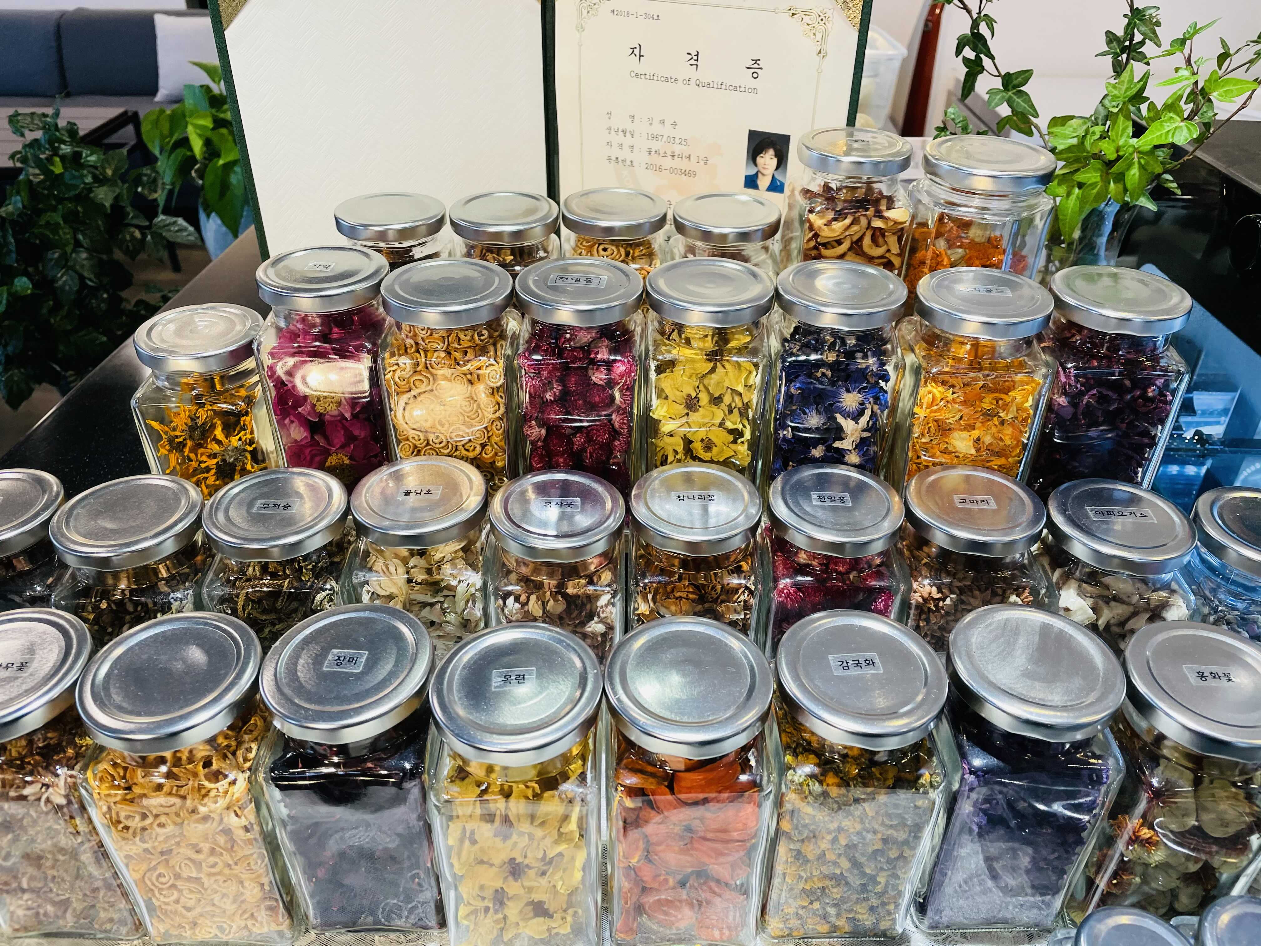 사장님이 꽃차 소믈리에 자격증이 있으신 분이더라고요. 이런 자격증이 있는줄 처음 알았어요...! 온갖 말린 꽃잎들이 즐비한데, 이 재료들로 꽃차를 만들어주시나 봅니다.