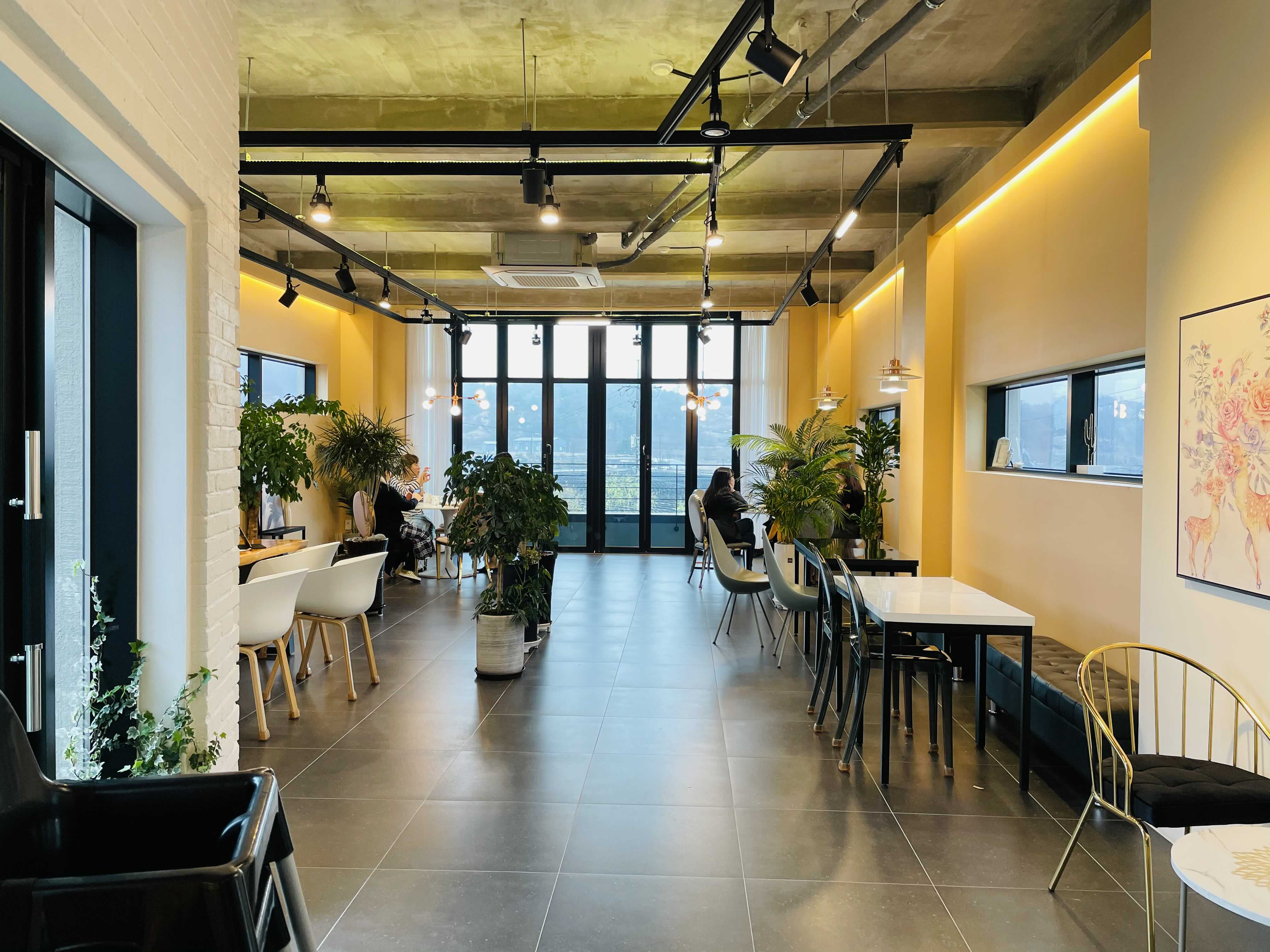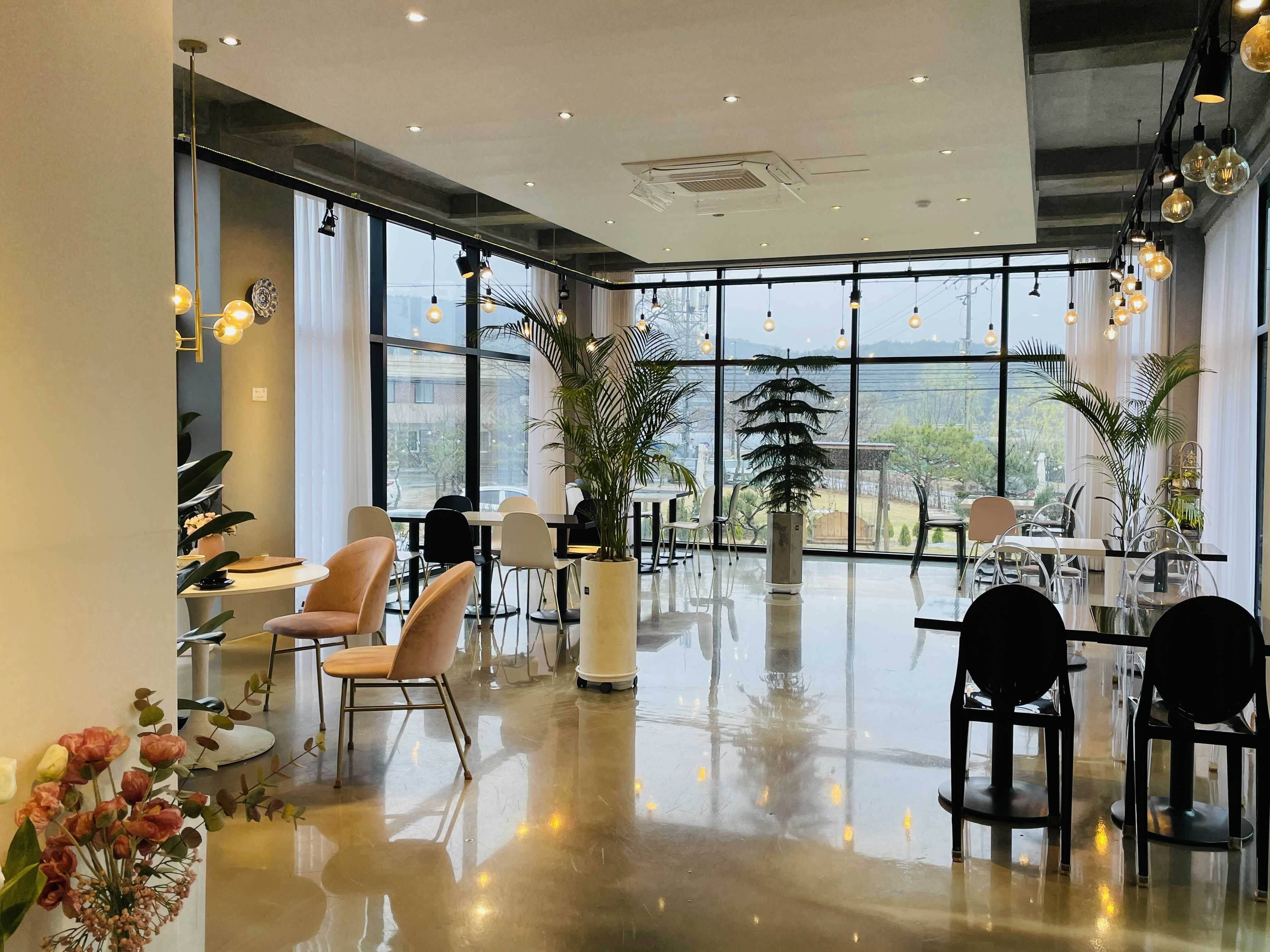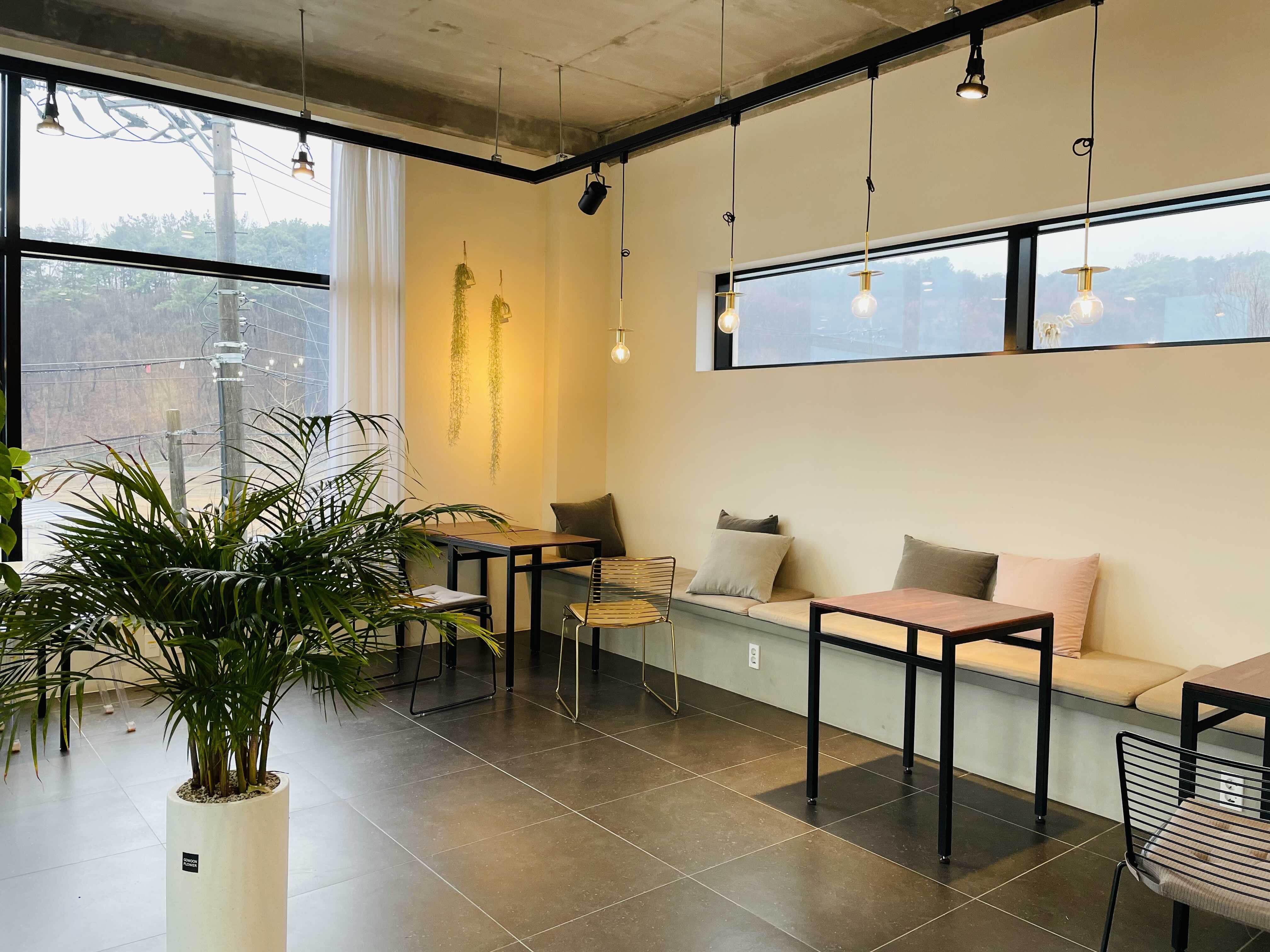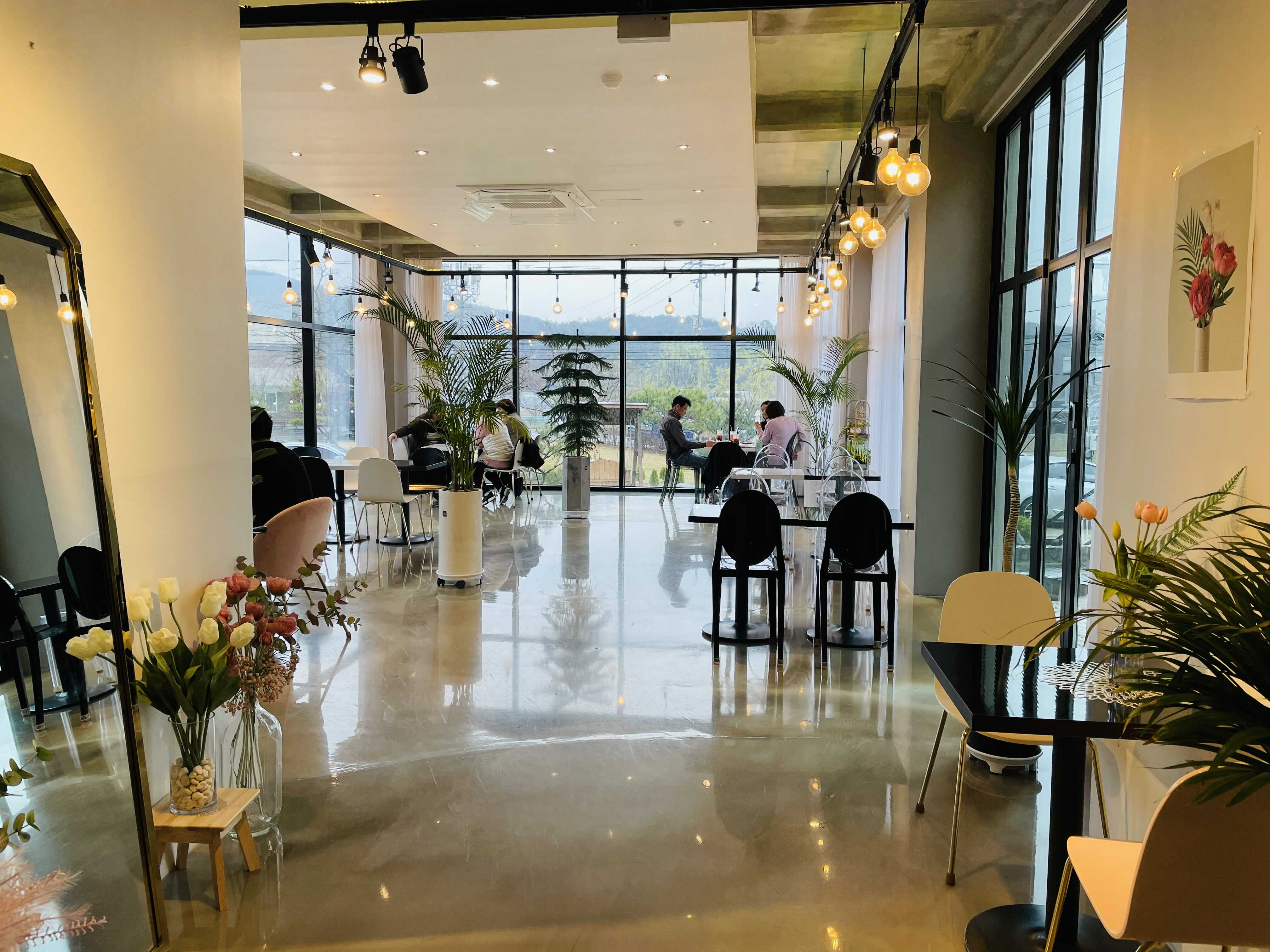 카페에 들어서면, 와... 이런 한적한 곳에 이런 카페가 있다니 하는 생각이 듭니다. 외관은 밋밋해 보였는데, 실내 공간이 매우 넓고 전구색 조명들을 포인트로 해서 인테리어도 잘해뒀어요.