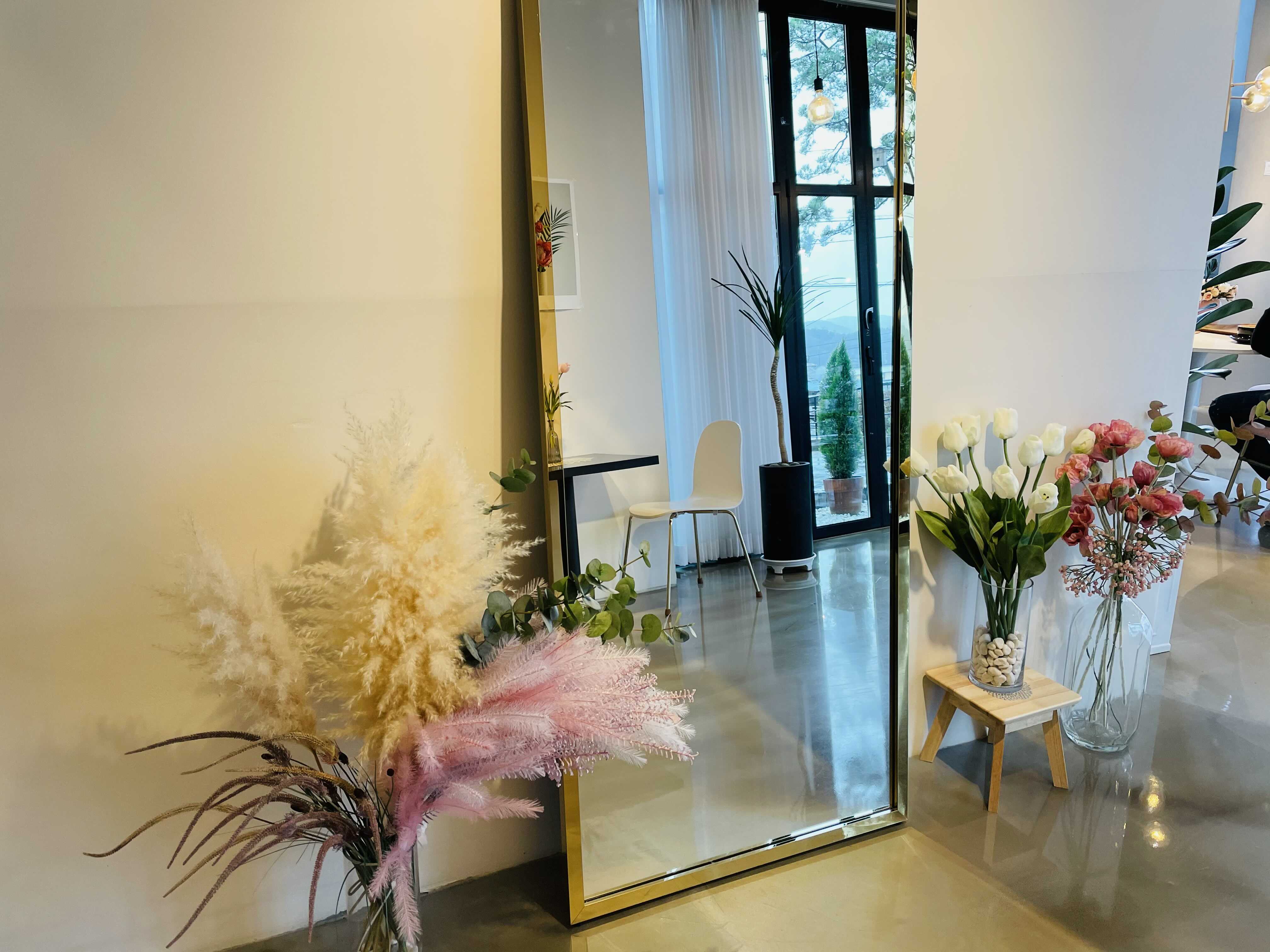 벽면 한쪽에 커다란 거울과 꽃병들 덕분에 더욱 화사한 분위기가 납니다.