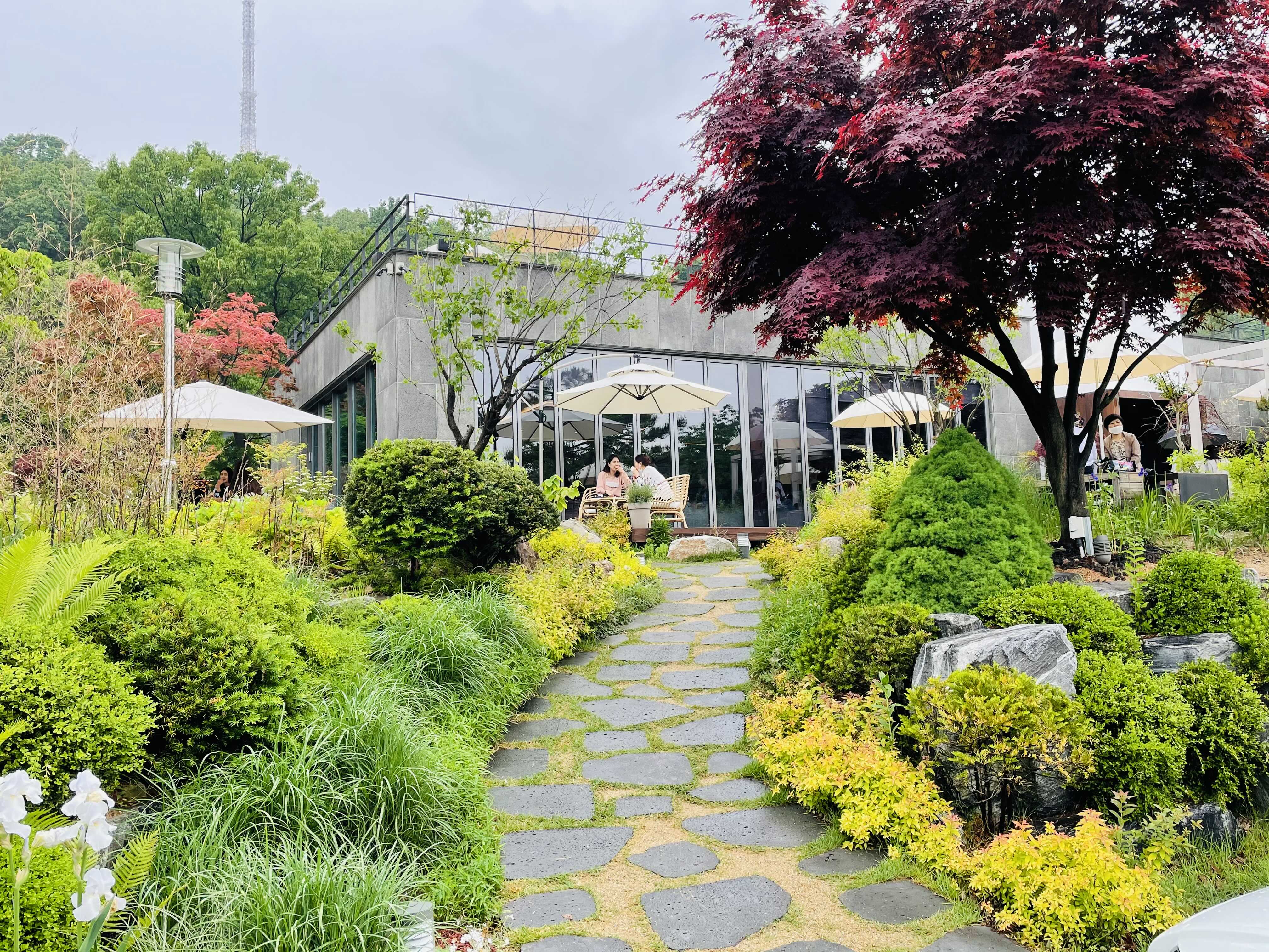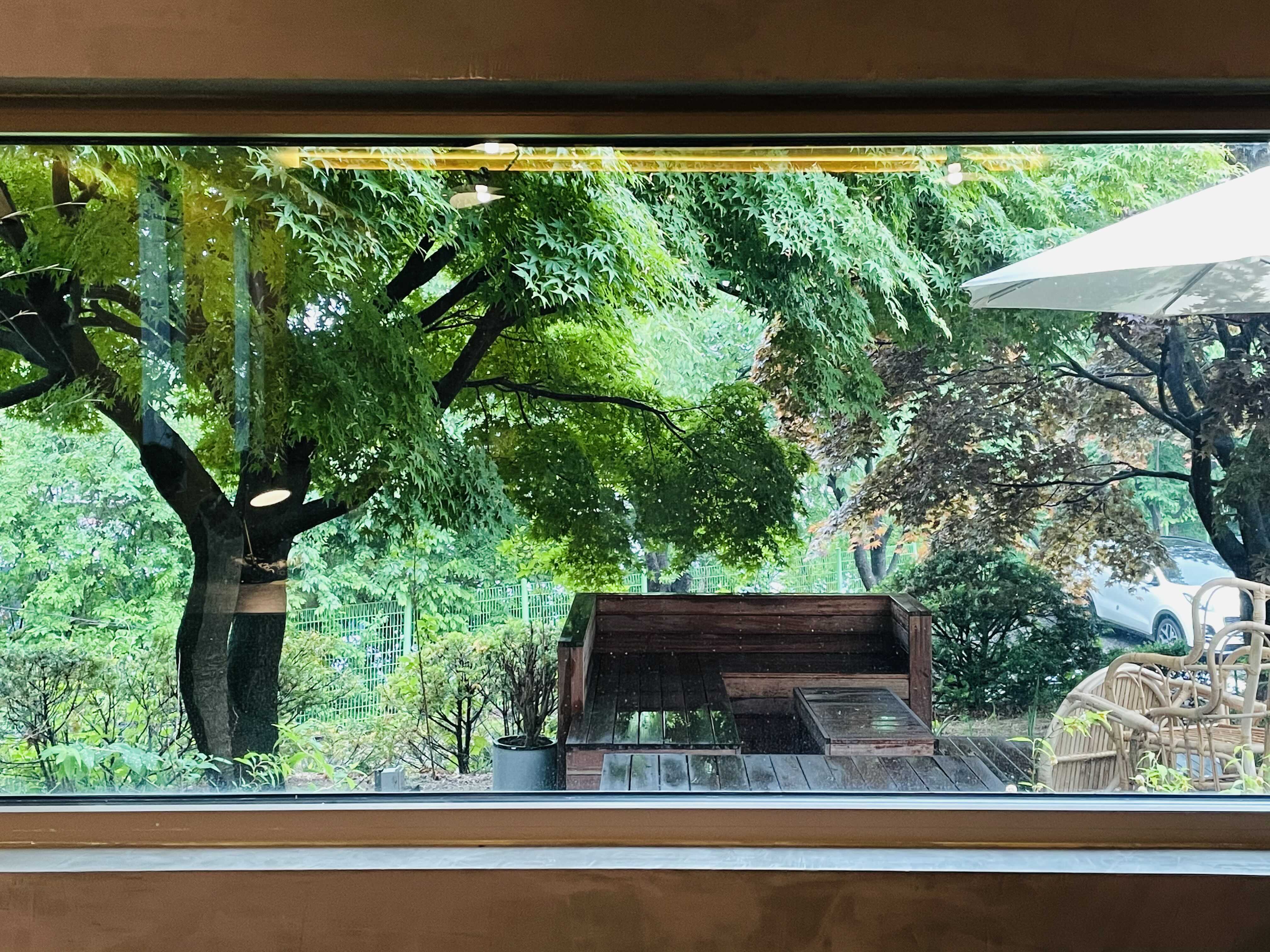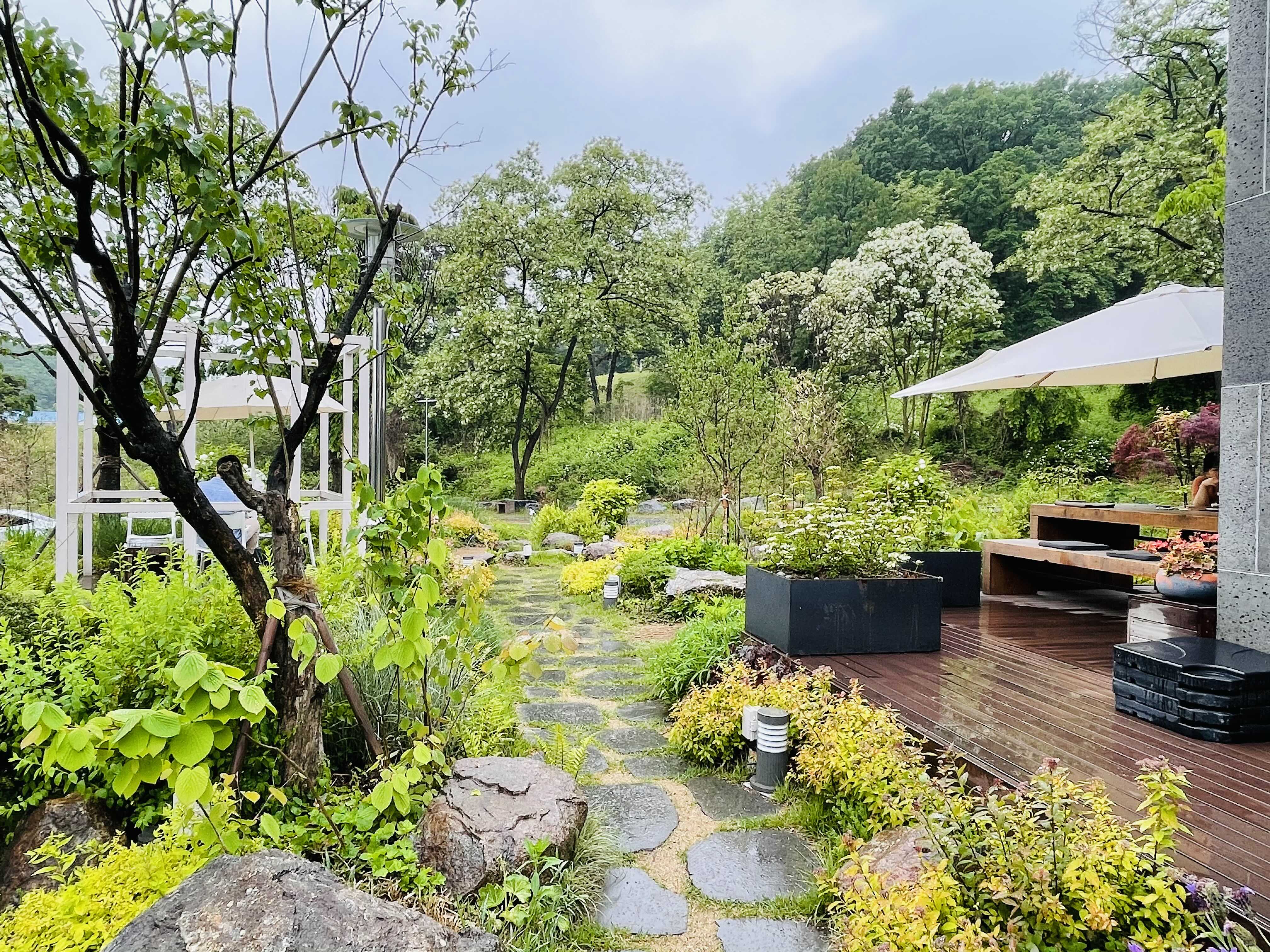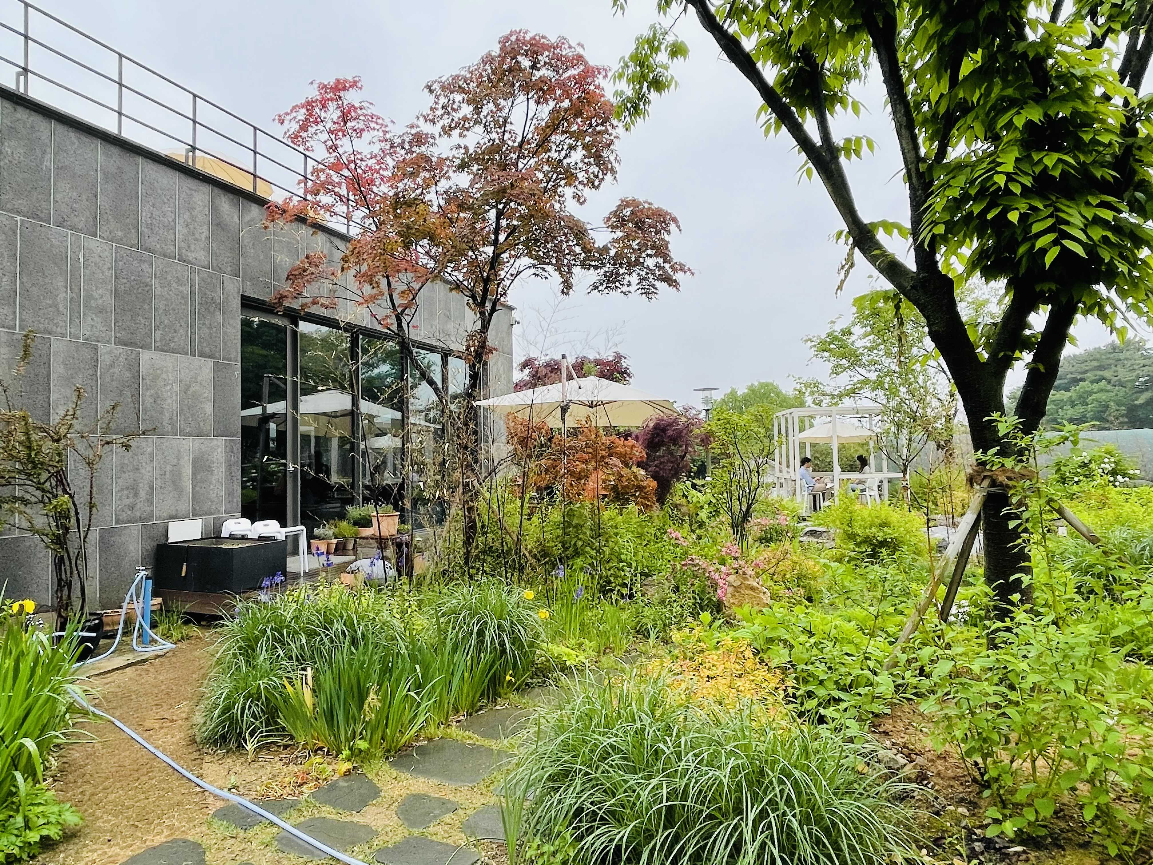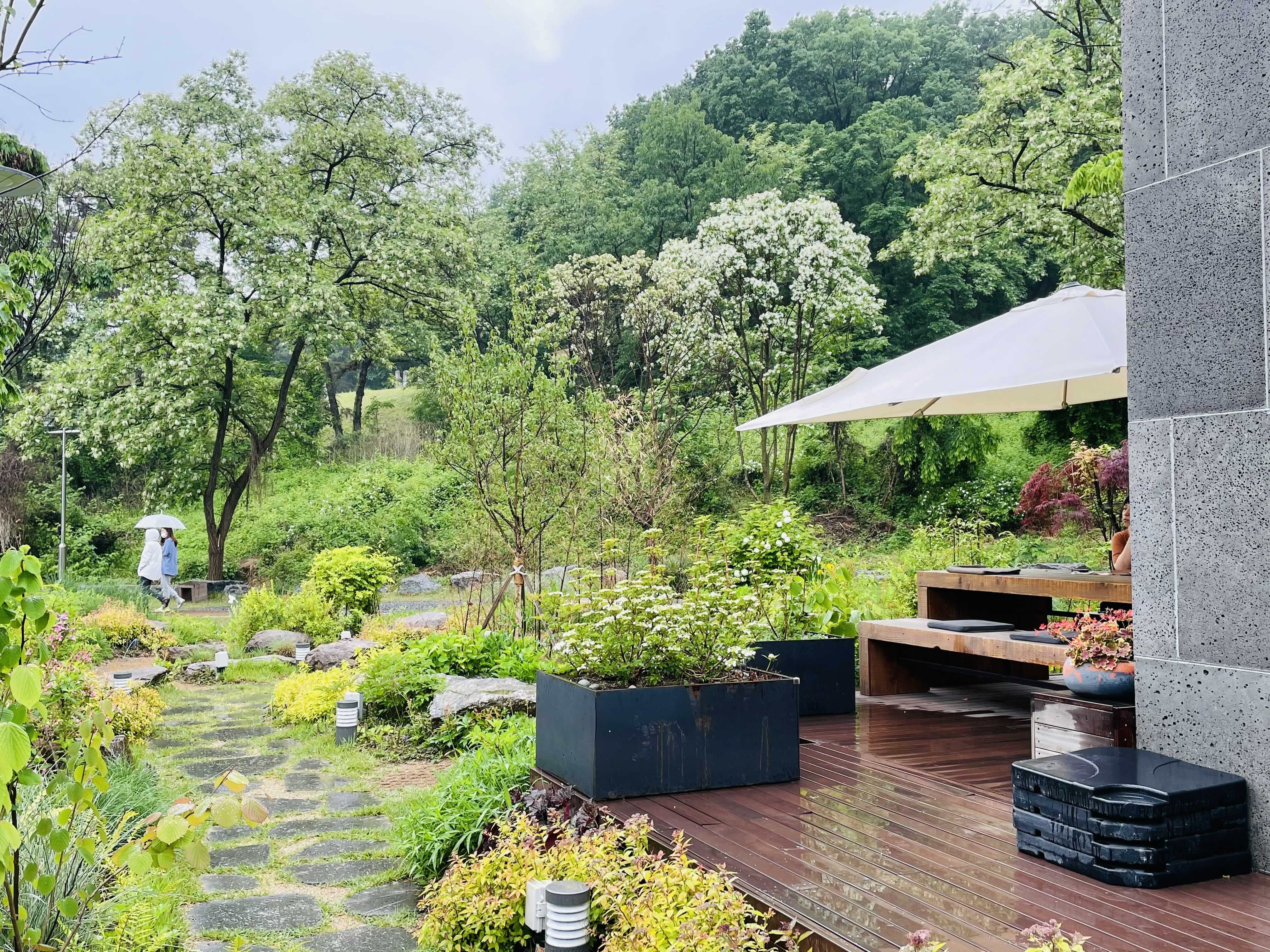 꽤 넓은 앞마당 사이 사이에 테라스 좌석을 마련해두었는데, 비가 오는데도 불구하고 만석이라 앉아보지는 못했어요.