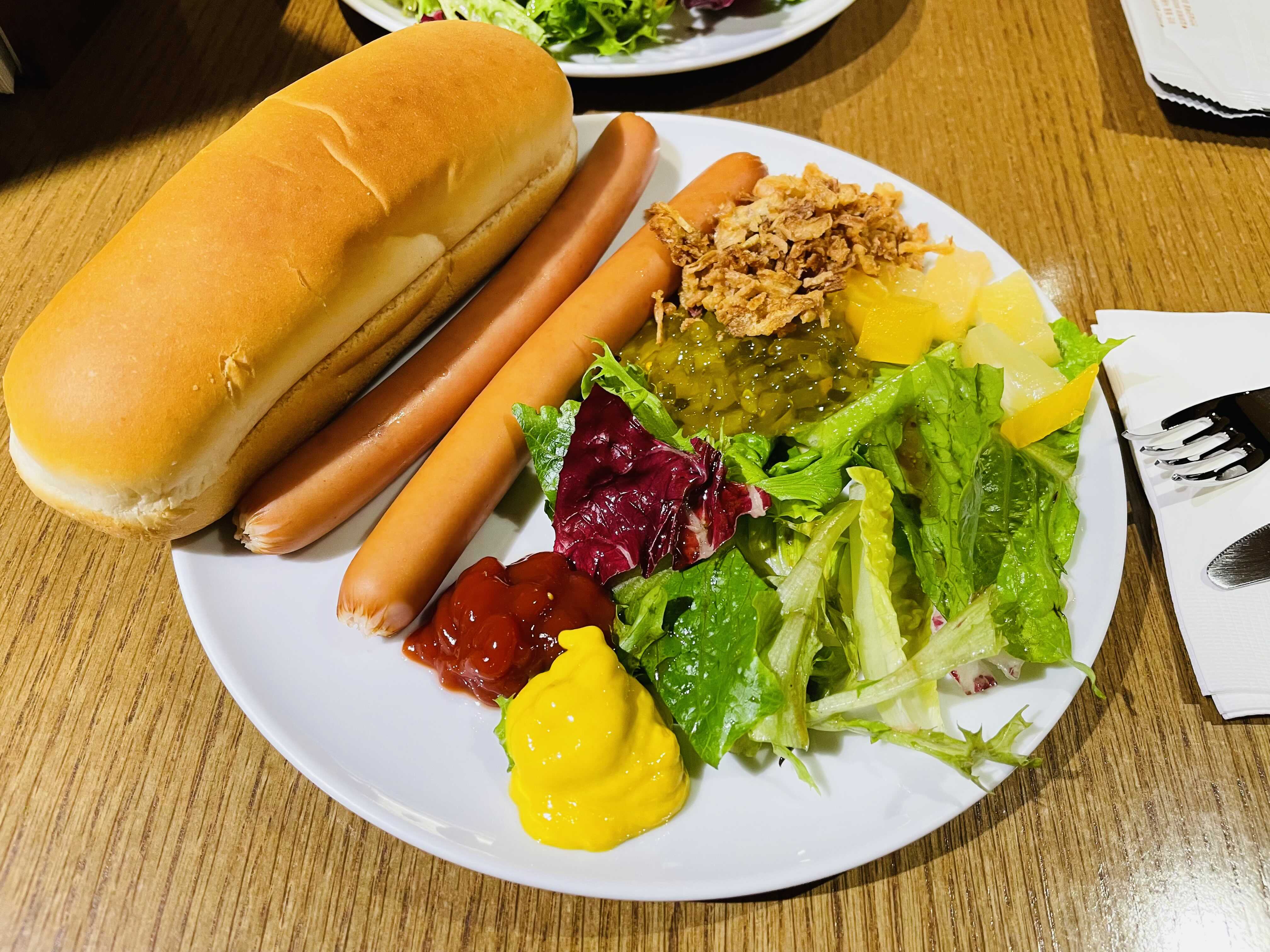오후 7시 Douglas Hour에 제공되는 스낵과 안주류들이에요. 핫도그를 만들어먹을 수 있도록 빵, 소시지, 샐러드, 피클과 양파 후레이크가 제공되어요. 나초, 치즈, 견과류, 야채 부각 등 주전부리도 있고요.