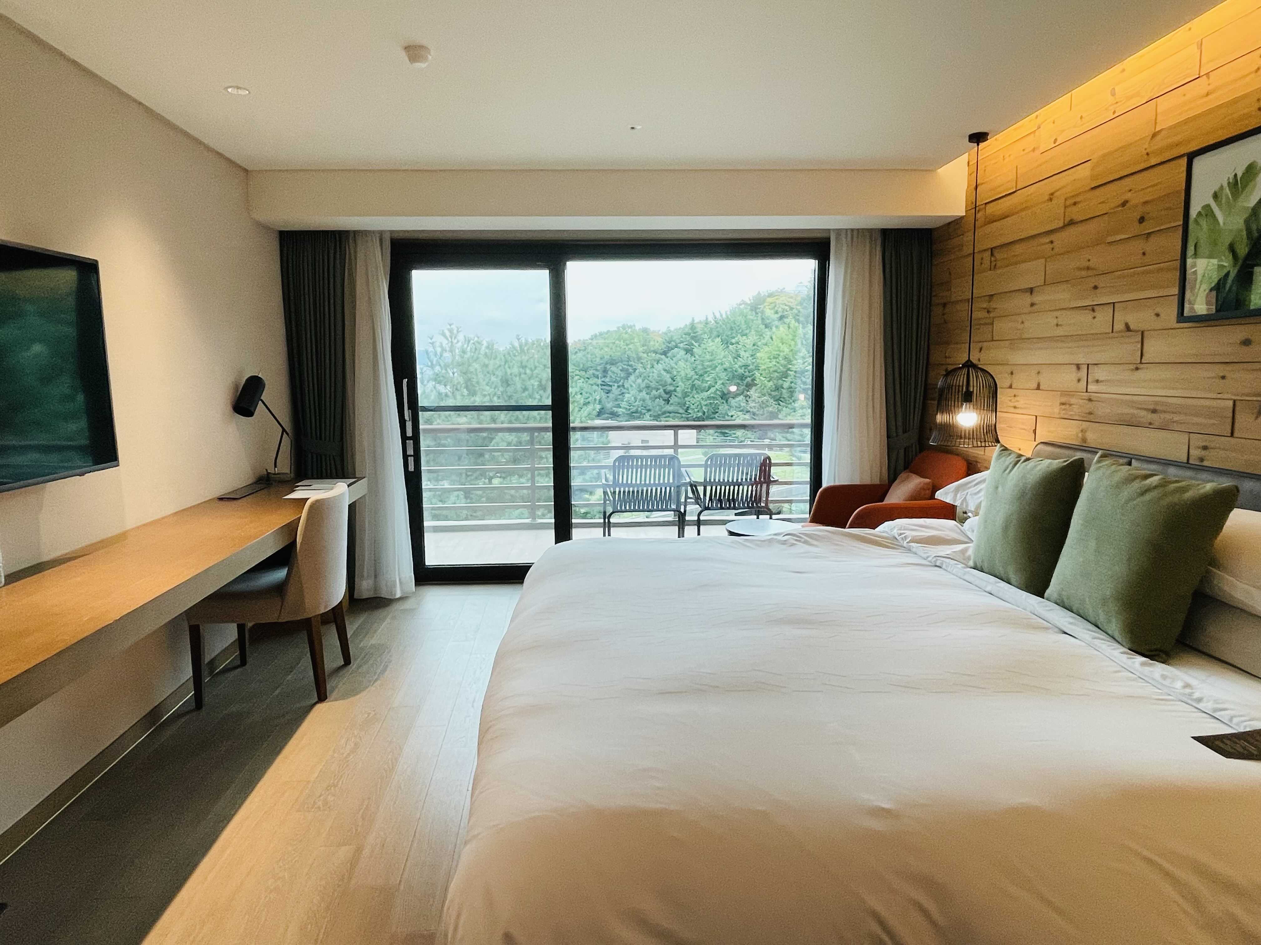 객실로 들어서면, 프런트와 마찬가지로 목재 인테리어와 녹색 잎이 그려진 액자가 먼저 눈에 들어옵니다. 커튼을 젖히면 푸르른 아차산과 풍경을 감상할 수 있는 테라스가 마련되어 있어요. 저희는 딜럭스룸 더블 베드로 예약했어요.