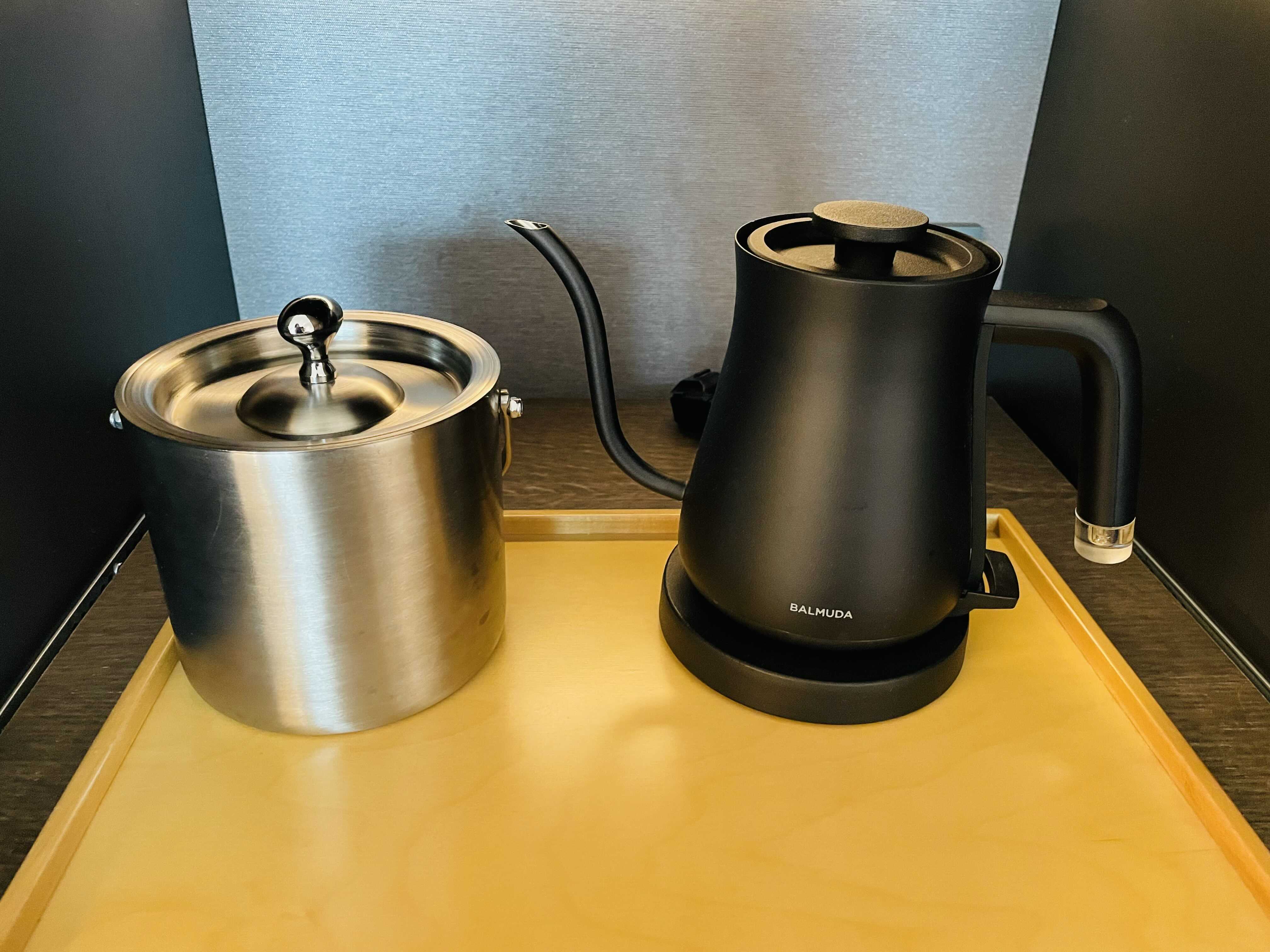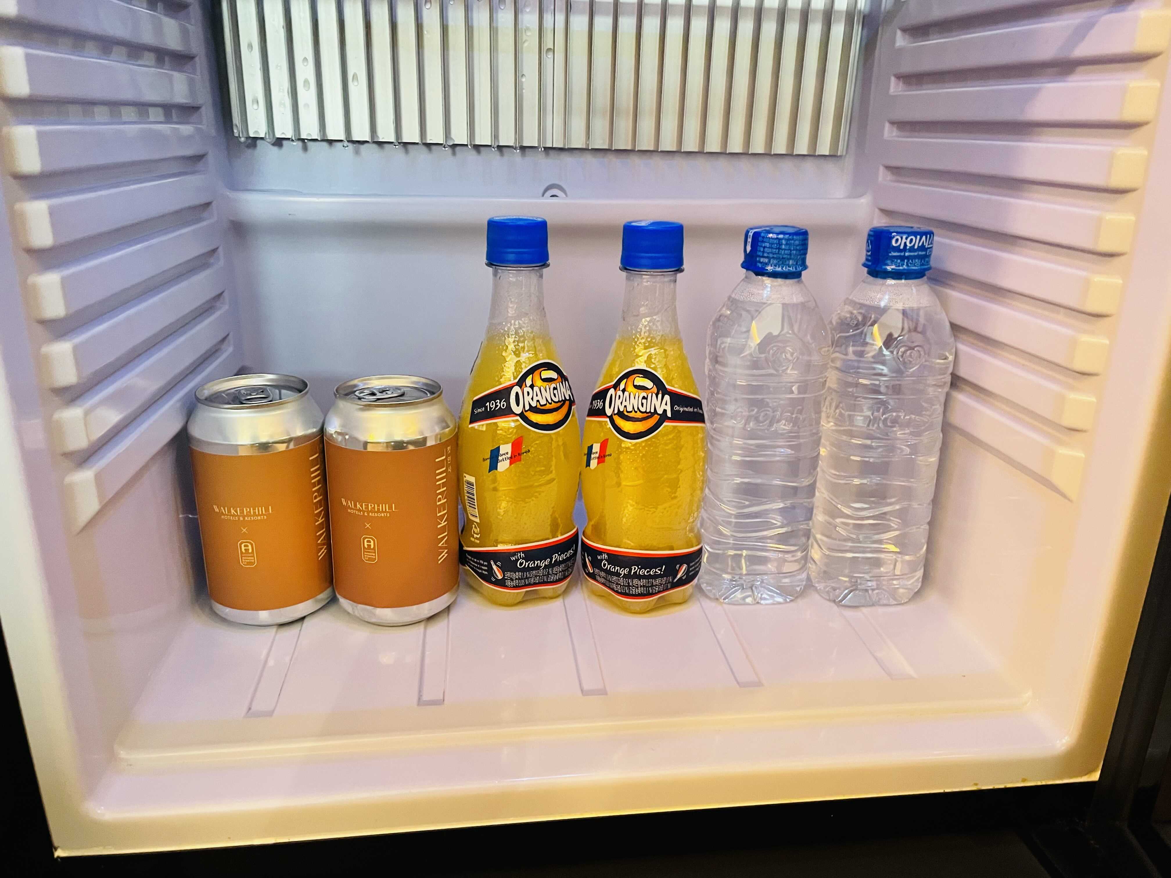얼음통과 발뮤다 전기포트가 준비되어 있고, 냉장고에는 맥주, 탄산음료, 생수가 들어가 있는데, 미니바 무료라서 마음껏 먹고 남은 건 가져왔어요.
