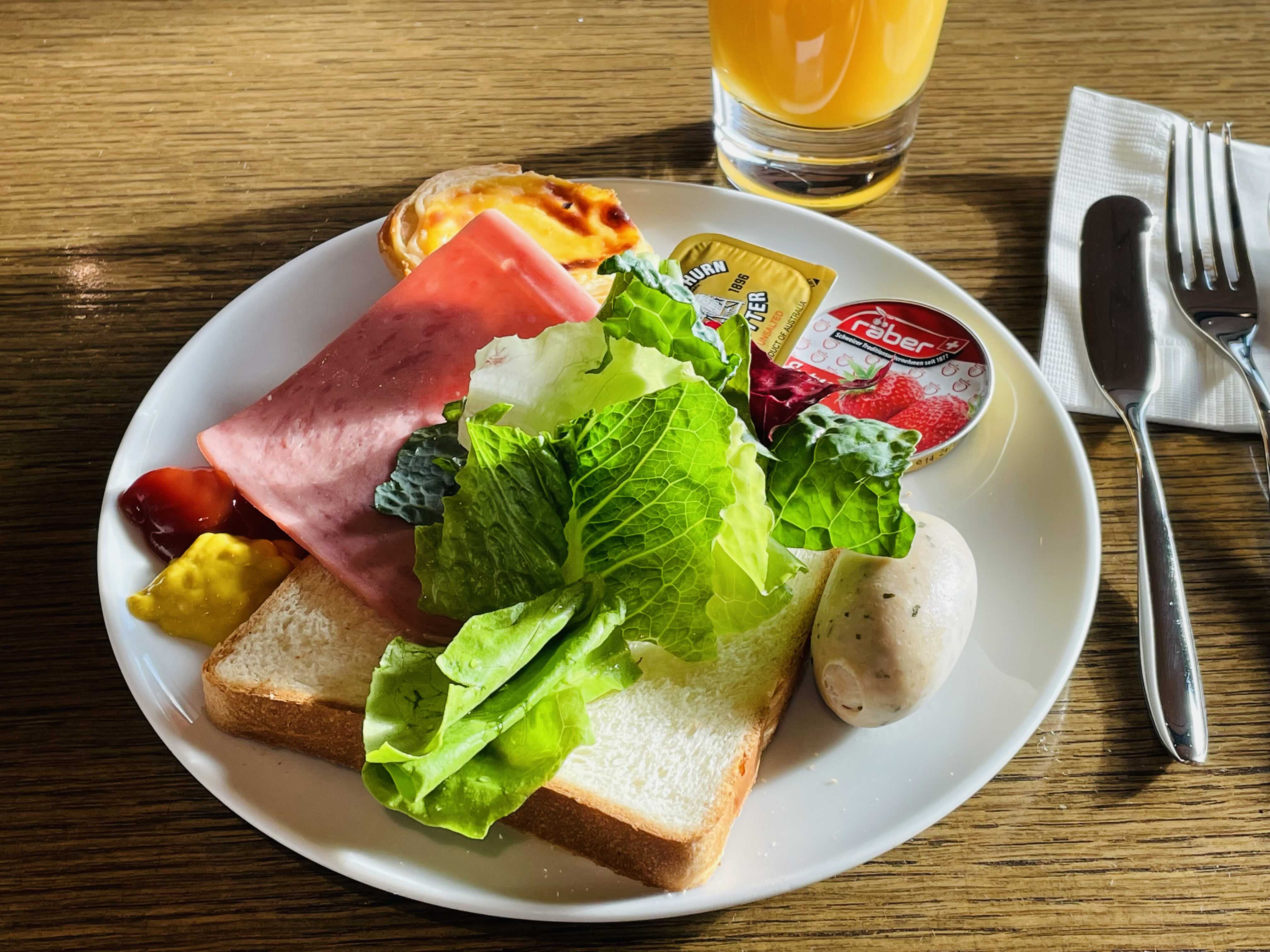 오전 7시 Light Breakfast에는 각종 빵, 샐러드, 소시지, 과일, 주스, 시리얼이 제공됩니다. 1인당 27,000원 추가하면 더뷔페에서 조식을 이용할 수도 있는데, 더글라스 라운지에서도 든든하게 조식을 드실 수 있어요.